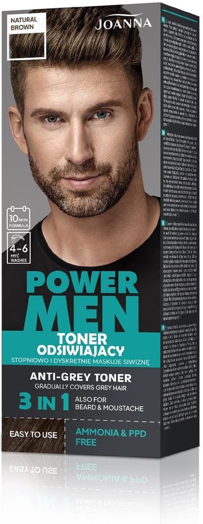 Joanna Power Men Odsiwiający Toner Do Włosów Dla Mężczyzn 04 Natural Brown 80g Skuteczne maskowanie siwizny Szukasz szybkiego i naturalnego sposobu na subtelną zmianę koloru włosów bez efektu odrostu? Toner odsiwiający Power Men to idealne rozwiązanie dla mężczyzn, którzy chcą przywrócić naturalny wygląd siwym włosom lub delikatnie podbić kolor. Produkt przeznaczony do włosów w odcieniu naturalny brąz (Natural Brown). Już po jednej aplikacji zauważysz różnicę – toner działa w zaledwie 10 minut, nadając włosom, brodzie lub wąsom subtelny kolor. Chcesz uzyskać intensywniejszy efekt? Powtórz aplikację po 2–3 dniach lub wydłuż czas działania do 30 minut. Formuła nietrwała – kolor utrzymuje się do 2–3 tygodni, w zależności od częstotliwości mycia. Toner stopniowo się wypłukuje, nie pozostawiając nieestetycznego odrostu. Formuła nie pogarsza kondycji włosów. Zawiera ekstrakty roślinne i składniki pielęgnujące, takie jak guarana, pieprz czarny i gliceryna. Dzięki poręcznej buteleczce z aplikatorem wystarczy: nałożyć – odczekać – spłukać. Toner można stosować wielokrotnie. Nie polecany do włosów blond, rudych, rozjaśnianych, z pasemkami lub wcześniej farbowanych innymi produktami. Sposób użycia: załóż rękawiczki ochronne. Równomiernie rozprowadź i wmasuj toner w suche włosy lub zarost. Pozostaw na 10 minut. Dokładnie spłucz. Aby uzyskać intensywniejszy odcień wydłuż czas aplikacji do 30 min łącznie. Intensywność oraz trwałość koloryzacji zależą od wyjściowego koloru i kondycji włosów.