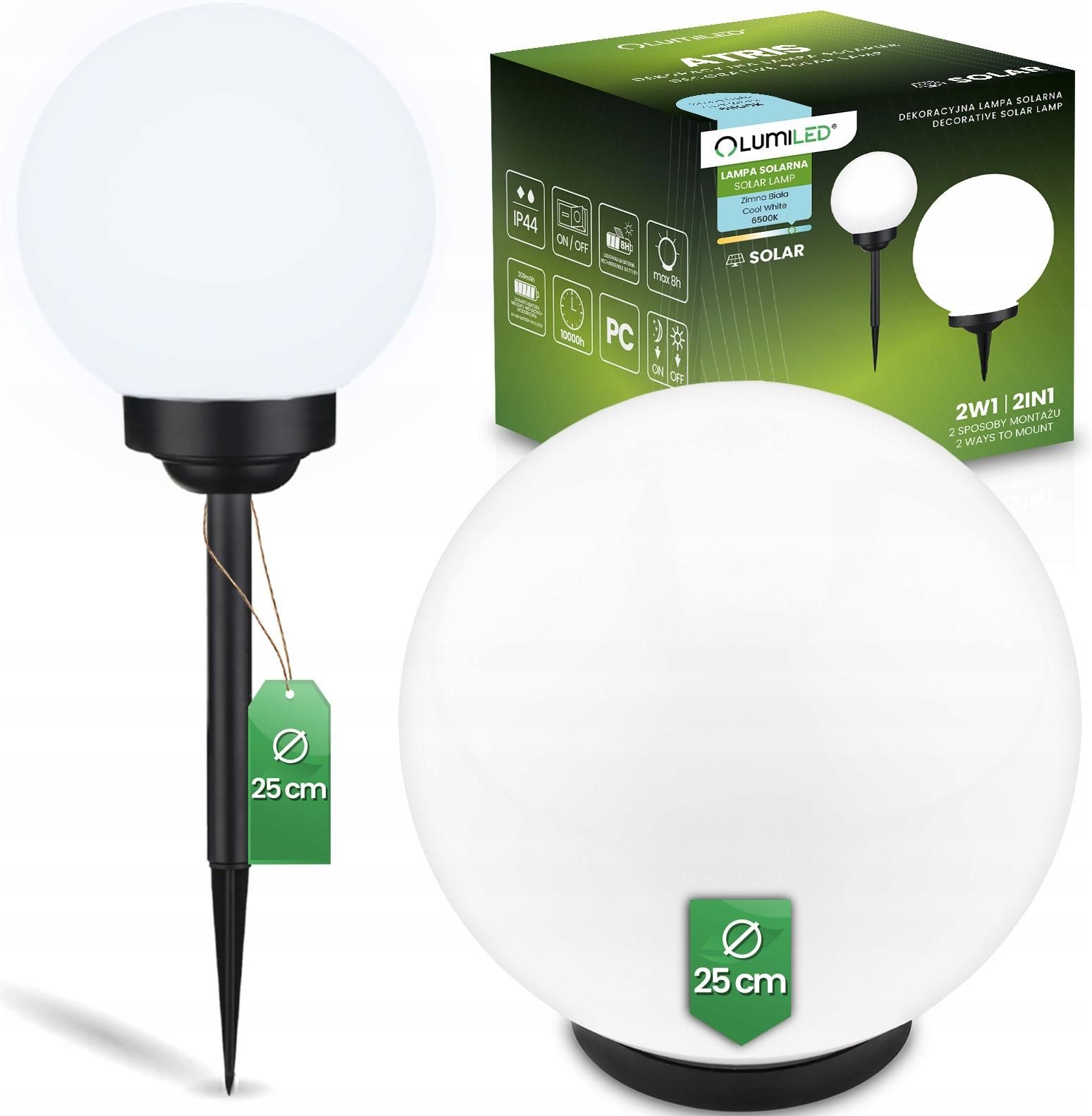 Lampa Solarna Ogrodowa LED 6500K IP44 25cm Wbijana Biała Kulka ATRIS LUMILED Główne cechy produktu Guzikowy akumulator: 1,2V 300mAh Amorficzny panel solarny efektywne ładowanie nawet przy niekorzystnym świetle Czas ładowania lampy: do 6h Czas pracy lampy: do 6h Wbudowany czujnik zmierzchu Duża trwałość: 10000h Wykonana z wytrzymałego tworzywa sztucznego PC Elegancki, czarny kolor i minimalistyczna forma Zimne, białe światło o temperaturze barwowej 6500K Energooszczędność i łatwość montażu Mleczny klosz rozpraszający równomiernie światło Przełącznik mechaniczny ON/OFF CENOWY HIT SEZONU Zestaw zawiera 1x Lampa solarna 1x Szpikulec Lampka solarna ATRIS o średnicy 25 cm znanej renomowanej w branży oświetleniowej marki LUMILED doda elegancji i nastrojowego oświetlenia Twojemu ogrodowi. Jej smukły, czarny szpikulec wbijany w ziemię stanowi stabilną podstawę, a jednocześnie dodaje lampie nowoczesnego i stylowego charakteru. Górna konstrukcja to okrągły, mleczny klosz, który zapewnia rozproszone, delikatne światło. Świeci chłodnym, białym światłem, przypominającym naturalne światło dzienne.Jej stylowy design sprawia, że świetnie nadaje się do oświetlania ścieżek, ogrodów czy tarasów, dodając elegancji i funkcjonalności. Chcesz wiedzieć więcej? Poznaj pełnię możliwości produktu marki Lumiled®! Efektywne ładowanie o każdej porze dnia Lampa wyposażona jest w amorficzny panel solarny, dzięki któremu skutecznie ładuje się nawet przy rozproszonym świetle dziennym, zapewniając delikatne, neutralne oświetlenie po zmroku. Technologia amorficzna wyróżnia się wysoką sprawnością energetyczną, umożliwiając efektywne działanie nawet przy słabym nasłonecznieniu. Dodatkowo, panel tego typu charakteryzuje się odpornością na wysokie temperatury, co minimalizuje spadki wydajności podczas upałów. Lampka posiada energooszczędne diody LED oraz akumulator o pojemności 300mAh, co zapewnia jej niezawodne działanie przez długi czas. Jest to doskonałe połączenie estetyki i ekonomicznej efektywności. Dwa sposoby montażu Zaprezentowana lampa solarna została stworzona z myślą o maksymalnej wygodzie użytkowania, oferując, dwa sposoby montażu, które umożliwiają jej dopasowanie do różnych warunków i aranżacji ogrodu. Montaż wbijany - za pomocą dołączonego do zestawu szpikulca można stabilnie osadzić lampkę w ziemi, co doskonale sprawdzi się przy oświetlaniu ścieżek czy podjazdu. Montaż naziemny - lampę można również postawić na dowolnej płaskiej powierzchni, np. na tarasie, schodach czy kamiennym podjeździe. Maksymalna funkcjonalność Szpikulec umożliwia łatwe i stabilne umocowanie w gruncie, posiada również praktyczny włącznik ON/OFF, który pozwala na manualne sterowanie oświetleniem. Możesz w ten łatwy i szybki sposób decydować, kiedy ma świecić, co zwiększa wygodę użytkowania i pomaga zaoszczędzić energię. Wysoka klasa ochrony Lampa solarna z klasą szczelności IP44 to doskonałe rozwiązanie dla osób poszukujących niezawodnego i trwałego oświetlenia zewnętrznego. Dzięki temu produkt jest zabezpieczony przed kroplami wody padającymi pod dowolnym kątem. Solidna konstrukcja oraz odporność na wilgoć i kurz, lampka solarna doskonale nadaje się do oświetlenia ogrodów, tarasów, ścieżek czy podjazdów. Obszary zastosowań dekoracja umieszczona wśród kwiatów lub trawnika oświetlenie przy ścieżkach, alejkach lub podjazdach oświetlenie na scenach i parkietach podkreślenie detali małej architektury ogrodowej uzupełnienie aranżacji roślinnej tło do sesji zdjęciowych dekoracja na imprezy plenerowe Specyfikacja Techniczna Marka: Lumiled Temperatura barwowa (K): 6500 Barwa światła: biała zimna Zasilanie: Solarne Materiał: poliwęglan (PC) Kolor: biały, czarny Sposób montażu: wbijany Trwałość (h): 10000 Stopień ochrony IP: IP44 Typ panelu: Amorficzny (A-Si) Pojemność (mAh): 300 Czas pełnego ładowania (h): 6 Czas działania (h): 6 Typ czujnika: zmierzchu Włącznik ON/OFF: tak Certyfikaty i Normy: CE, RoHS, UKCA Wymiary: Długość (cm): 71 Wysokość (cm): 71 Szerokośc (cm): 25 Postaw na markę Lumiled®! Lumiled® to polska marka oświetleniowa oficjalnie zarejestrowana w europejskim systemie EUIPO. Markę Lumiled® tworzą pasjonaci oświetlenia, którzy ze starannością projektują i dobierają każdy produkt od ponad 10 lat, dbając o najwyższą jakość, funkcjonalność oraz estetykę. Ich zaangażowanie przekłada się na innowacyjne rozwiązania, które spełniają oczekiwania nawet najbardziej wymagających klientów. Dlaczego warto wybrać produkty marki Lumiled®?! Markę tworzą Ludzie, którym w szczególności zależy na Twoim bezpieczeństwie i satysfakcjiz zakupów, produkty posiadają wszystkie niezbędne certyfikaty oraz przechodzą szczegółowe kontrole. Oszczędzasz pieniądze — podążamy za ciągłymi zmianami w dziedzinie oświetlenia, zmieniając źródła światła w produktach, które przy tych samych parametrach świetlnych zużywają znacznie mniej energii. Dzięki czemu w prosty sposób obniżasz rachunki za prąd i dbasz o środowisko – bez kompromisów w jakości oświetlenia. Projektujemy i kontrolujemy — przemyślana przez nas konstrukcja produktów umożliwia ich łatwy montaż — bez konieczności korzystania z kosztowych usług a nasze wewnętrzne kontrole pozwalają na sprzedaż tylko sprawdzonych produktów. Aktywnie śledzimy i wdrażamy najnowsze trendy w dziedzinie oświetlenia, oferując produkty, które łączą nowoczesny design z funkcjonalnością. Produkty marki Lumiled® łączą wysoką jakość wykonania z przystępną ceną, dostępna dla wszystkich. Kupujesz produkt na lata, nie na chwilę. Wysokie bezpieczeństwo użytkowników, kupując produkty marki Lumiled® masz pewność, że nie zawierają one rtęci i ołowiu. Wszystkie produkty posiadają certyfikat RoHS. Dbamy o Twój