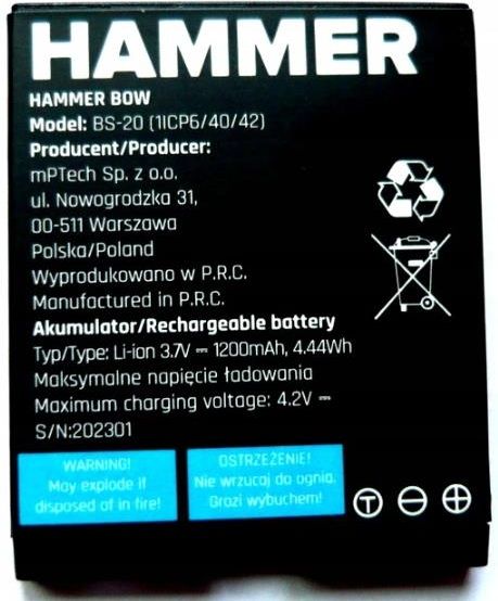 Oryginalna Bateria Hammer BOW/BOW+/DIG BS-20 1200mAh Towar jest w 100% NOWY i NIEUŻYWANY. Produkt z Polskiej Dystrybucji jest w 100% oryginalny. Zapakowane fabrycznie przez producenta. W skład zestawu wchodzi Bateria Hammer BOW/BOW+/DIG BS-20 1200 mAh Bateria Hammer BOW/BOW+/DIG BS-20 1200 mAh Typ BS-20 Pasuje do telefonu Hammer BOW/BOW+/DIG BS-20 Pojemność 1200mAh