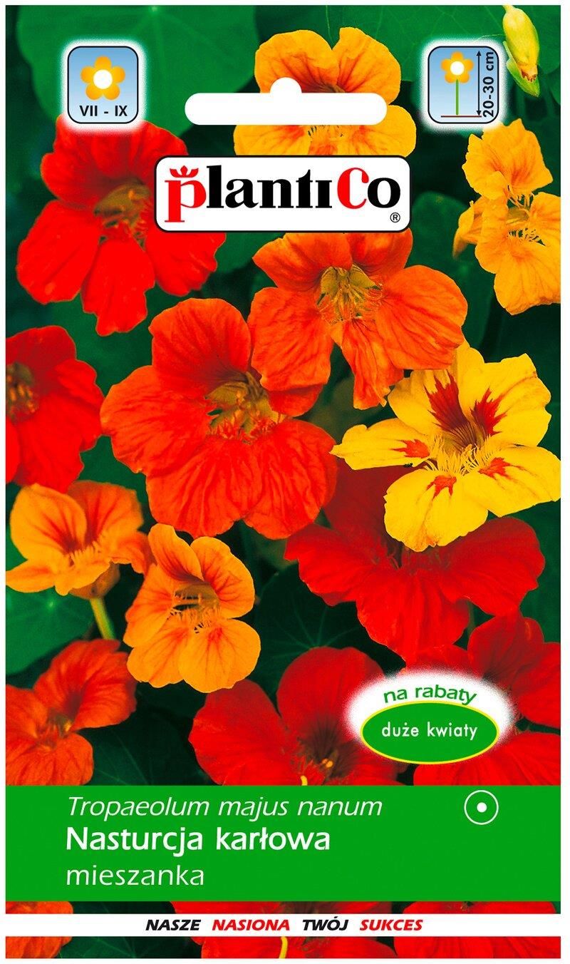 Nasiona kwiatów PlantiCo. Nasturcja karłowa, mieszanka kolorów - roślina jednoroczna, karłowa, która zakwita w 8 tygodni po wysiewie. Wytwarza liczne kwiaty o kształcie otwartego kielicha. Znajduje zastosowanie na rabatach, jako kwiat cięty, do skrzynek balkonowych i mis. Nasiona wysiewa się wprost do gruntu. Wysokość roślin wynosi 20-30cm. Kwitnie od lipca do września.