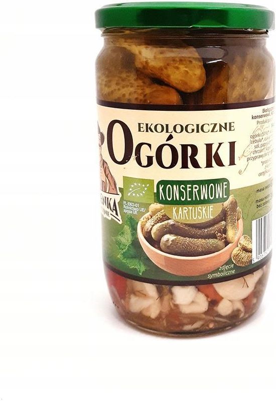 OGÓRKI KONSERWOWE KARTUSKIE BIO 670 g - OD ZENKA TRADYCYJNIE OD ZENKA TRADYCYJNIE (przetwory, warzywa SKŁADNIKI Składniki: ogórki* 51 %, woda, ocet*, cebula*, cukier trzcinowy*, sól, papryka*, marchew*, chrzan*, koper*, czosnek*, przyprawy* ( w tym GORCZYCA* ) (*certyfikowany składnik ekologiczny).OPISEkologiczne ogórki konserwowe kartuskie przygotowywane są według tradycyjnej receptury, przy użyciu jedynie najwyższej jakości składników. Kruche, o delikatnym aromacie i wykwintnym smaku, znakomicie nadają się jako dodatek do sałatek, kanapek, koreczków i zimnych przystawek. Produkt pasteryzowanyWARTOŚĆ ODŻYWCZA W 100 gWartość energetyczna 93 kJ /22 kcal Tłuszcz 0,1 g w tym kwasy tłuszczowe nasycone 0 g Węglowodany 5,1 g w tym cukry 2,9 g Białko 0,5 g Sól 1,0 g INFORMACJA ALERGENNAProdukt może zawierać: zboża zawierające GLUTEN, SOJĘ i rybyZALECANE WARUNKI PRZECHOWYWANIA Przechowywać w suchym i chłodnym miejscu, po otwarciu przechowywać w temperaturze +4 °C Kraj pochodzenia: Polska Ilość w opakowaniu zbiorczym: 1 Wysokość opakowania jednostkowego (cm): 15.00 Głębokość opakowania jednostkowego (cm): 9.00 Masa netto (g): 670 Gwarantowany termin przydatności (w dniach): 160 Szerokość opakowania jednostkowego (cm): 9.00 Producent: OD ZENKA TRADYCYJNIE (przetwory. warzywa kiszone) Bez Cukru: BEZ CUKRU (w składnikach) CERTYFIKAT BIO: CERTYFIKAT BIO Kraj pochodzenia składników (słownik BP): Polska WEGAŃSKI: WEGAŃSKI WEGETARIAŃSKI: WEGETARIAŃSKI Producent - nazwa i adres: BIO PLANET S.A.. WILKOWA WIEŚ 7. 05-084 LESZNO BEZ GLUTENU (w składnikach): BEZ GLUTENU (w składnikach)