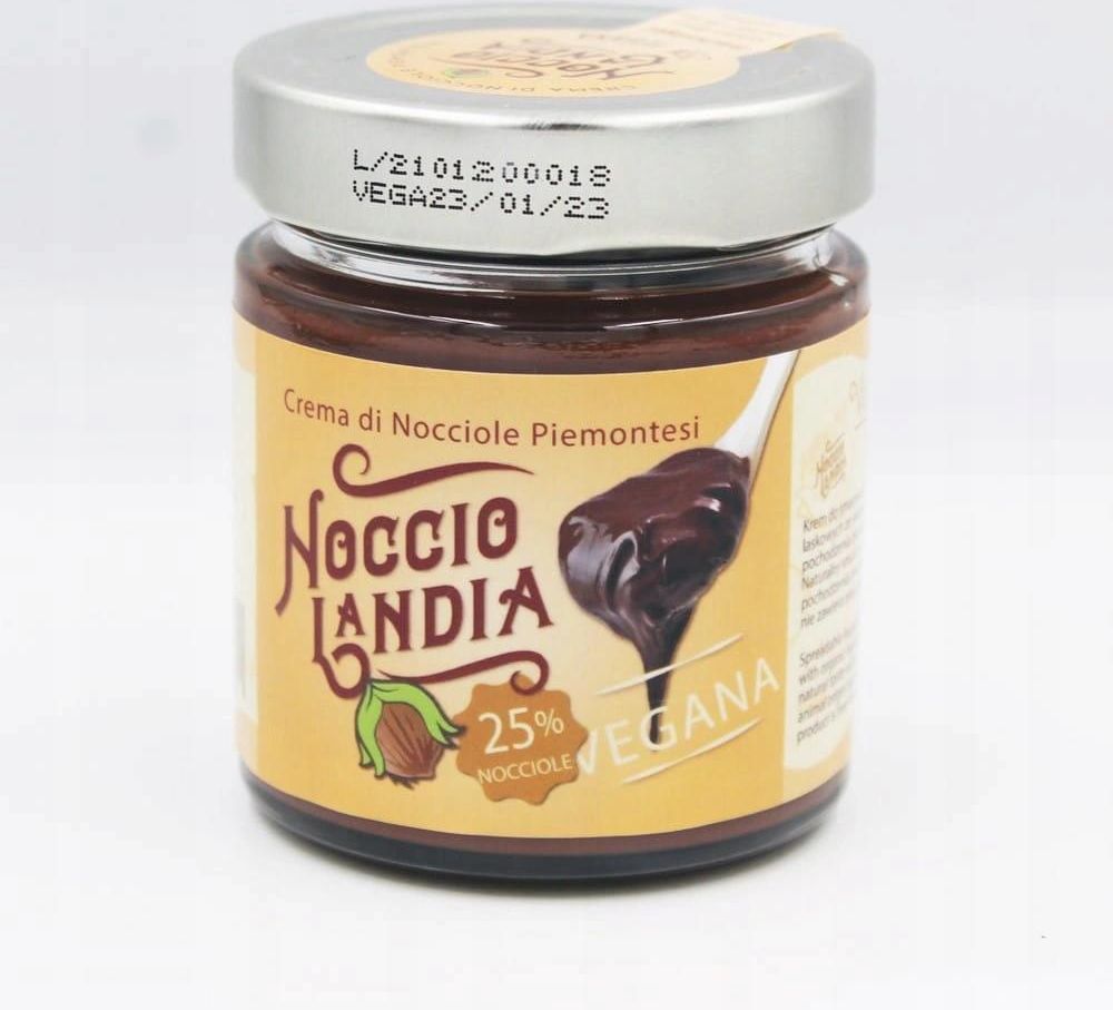 Argenesi Nocciolandia Vegana 25% 200 G Orzechowo-Kakaowa Orzechy laskowe z Piemontu Krem do Smarowania Nocciolandia Vegana 25% Orzechowo-Kakaowy 200g Argenesi Zalety Bez dodatku sztucznych emulgatorów, Bez glutenu, Bez oleju palmowego. Opis produktu Nasza wyjątkowa receptura kremu orzechowego wegańskiego to harmonia smaku i etyki. Wyprodukowany bez użycia oleju palmowego, glutenu oraz sztucznych barwników i aromatów, ten krem nie tylko doskonale smakuje, ale także wpisuje się w zdrowy styl życia. Idealny dla osób, które dbają o swoje zdrowie i środowisko. Śniadania ożywiają się dzięki delikatnemu posmarowaniu tostów lub placków ryżowych naszym kremem orzechowym. Jego konsystencja sprawia, że jest idealnym dodatkiem do owsianek, smoothie bowl i naleśników – dostarcza cennych składników odżywczych, w tym białka, zdrowych tłuszczy i błonnika. Możesz także dodać go do swojego ulubionego jogurtu roślinnego, by dodać nieco słodyczy i chrupkości. Ten krem orzechowy to również doskonały składnik wypieków – dodaje intensywnego orzechowego smaku muffinom, ciastom i plackom. Możesz go także użyć jako składnik polewy do deserów, aby nadać im wyjątkowego aromatu i konsystencji. Jeśli zależy Ci na szybkich i pożywnych przekąskach, krem orzechowy doskonale komponuje się z kawałkami świeżych owoców, marchewką czy selerem. Spróbuj także dodać go do swoich sałatek, by podkreślić ich smak i dodać nieco kremowej tekstury. Zadbaj o swoje podniebienie, nie rezygnując z wartości odżywczych i moralnych przekonań – sięgnij po nasz wegański krem orzechowy, który przyjemnie zaskoczy Cię swoją uniwersalnością i nieodparty orzechowym aromatem. Składniki: cukier nierafinowany bio, ORZECHY LASKOWE z Piemontu 25%, maltodekstryna, masło kakaowe, oleje roślinne (słonecznikowy, krokosz barwierski), kakao w proszku 7%, emulgator: lecytyna słonecznikowa; sól morska, skoncentrowany ekstrakt z wanilii. EAN: 4260212539378