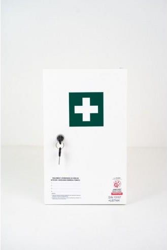 Stalowa apteczka ścienna "40" z wyposażeniem przeznaczona jest do zakładów pracy. Szafka metalowa wykonana z blachy stalowej malowanej farbą proszkową w kolorze białym. Zamykana na klucz. Uchwyty do zamocowania na ścianie. Termin ważności produktów sterylnych wynosi 5 lat. Wyroby medyczne oznakowane znakiem CE. Apteczka spełnia wymagania norm Unii Europejskiej. Wymiary apteczki: 360 mm x 220 mm x 120 mm Wyposażenie apteczki zgodne z normą DIN 13157: Plaster z opatrunkiem 6 X 10 cm – 8 szt Plaster na szpulce 5M X 2,5 cm – 1 szt Zestaw plastrów (4 rodzaje) – 20 szt/1 opak Bandaż elastyczny 4 M X 6 cm – 2 szt Bandaż elastyczny 4 M X 8 cm – 2 szt Rękawiczki jednorazowe winylowe – 4 szt/2 pary Chusta opatrunkowa 60 X 80 cm – 1 szt Zimny kompres – 1 szt Chusta z fizeliny 20 X 30 cm – 5 szt/1 opak Bandaż z kompresem (opatrunek indywidualny) 6 X 8 cm – 1 szt Bandaż z kompresem (opatrunek indywidualny) – 8 X 10 cm - 3 szt Bandaż z kompresem (opatrunek indywidualny) 10 X 12 cm - 1 szt Kompres na rany – 6 szt/3 opak Kompres na oko 5 X 7,5 cm – 2 szt Chusta trójkątna – 2 szt Koc termiczny (ratunkowy) – 1 szt Nożyczki – 1 szt Worek foliowy – 2 szt Instrukcja udzielania pierwszej pomocy – 1 szt Ustnik do sztucznego oddychania - 1 szt