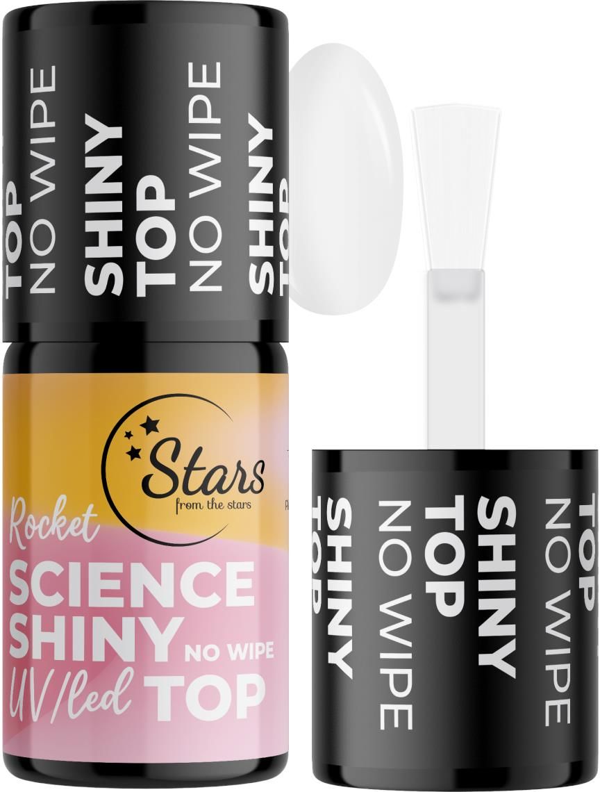 Stars from the Stars Rocket Science Shiny Top No Wipe Top No Wipe perfekcyjnie zabezpiecza lakier hybrydowy, jest odporny na ścieranie i nie żółknie pod wpływem czynników zewnętrznych. Produkt nie zostawia lepkiej warstwy dyspersyjnej, nie trzeba przemywać go cleanerem. Pozostawia intensywnie lśniące wykończenie na paznokciach. Wersja: Shiny Pojemność: 5g