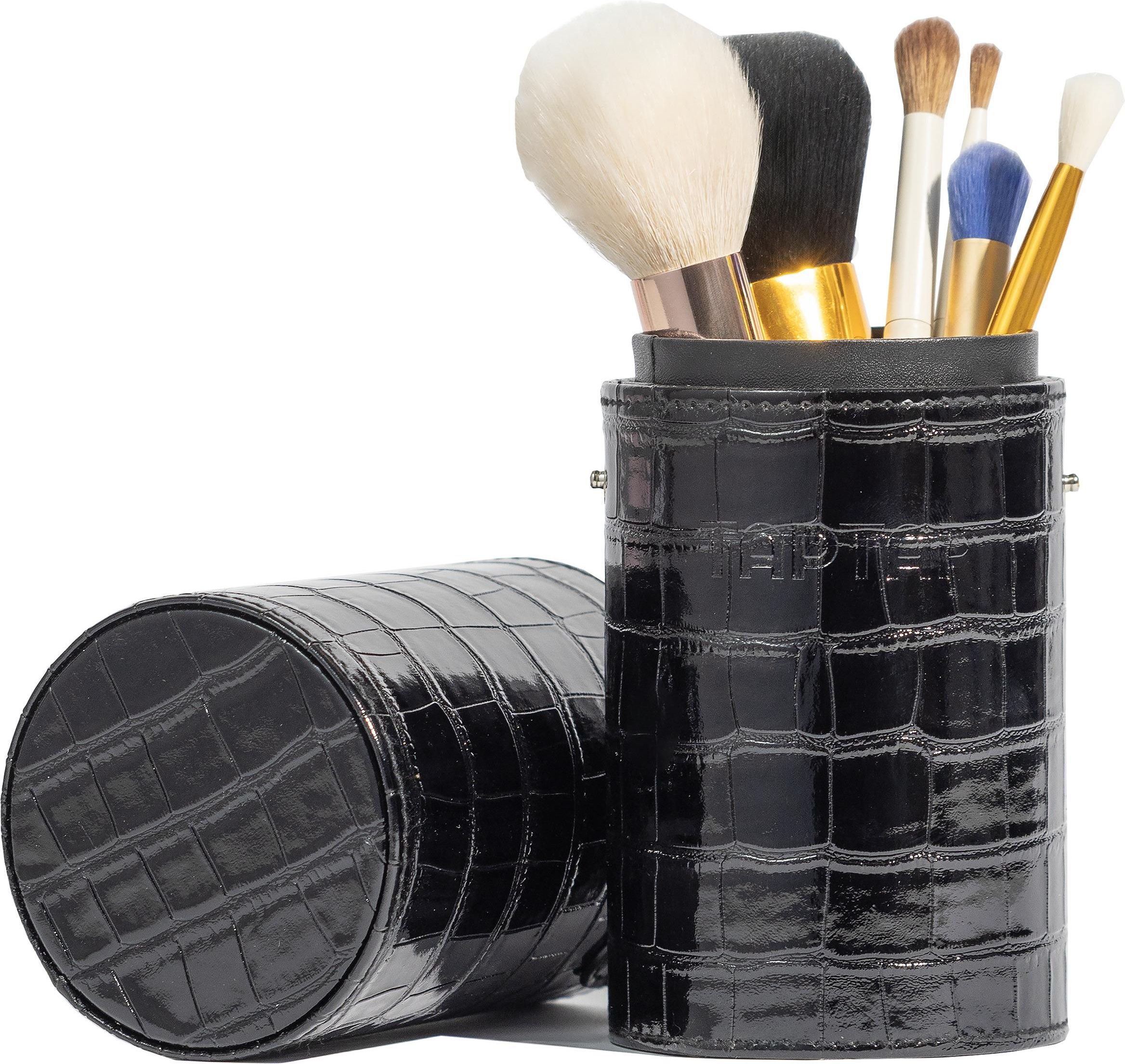 TAPTAP Tuba na Pędzle z Ekoskóry Zorganizuj swoje ulubione pędzle w eleganckim etui od TAPTAP! Solidna tuba wykonana z wytrzymałej i łatwej w czyszczeniu skóry ekologicznej z tłoczeniem. Idealna do przechowywania i transportu pędzli do makijażu. Dzięki zamknięciu na zatrzaski oraz cylindrycznemu kształtowi, zapewnia doskonałą ochronę przed uszkodzeniami, kurzem i deoformacją włosia. Doskonale sprawdza się zarówno w podróży, jak również na toaletce jako pojemnik na zestaw pędzli. Ta stylowa tuba to must-have każdej makijażowej pasjonatki i profesjonalnej wizażystki! Wymiary: 7 x 23 cm