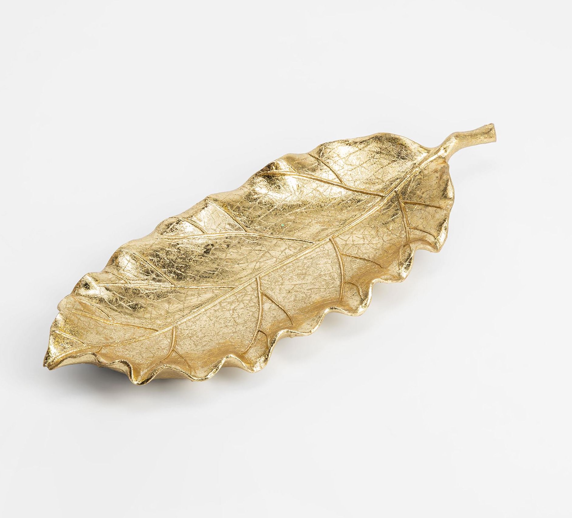 Stwórz elegancką aranżację w swoim domu dzięki tej złotej paterze, która łączy w sobie inspirację naturą z wykończeniem w stylu glamour. Patera ma kształt liścia z wyraźnym, szczegółowym unerwieniem, a jej lśniąca, złota powierzchnia dodaje wnętrzu blasku. Dzięki zastosowaniu polyresinu patera jest bardziej trwała i łatwa w pielęgnacji. Doskonale sprawdzi się jako ozdoba stołu czy komody, ale także jako praktyczny element do przechowywania drobiazgów, takich jak klucze czy biżuteria.