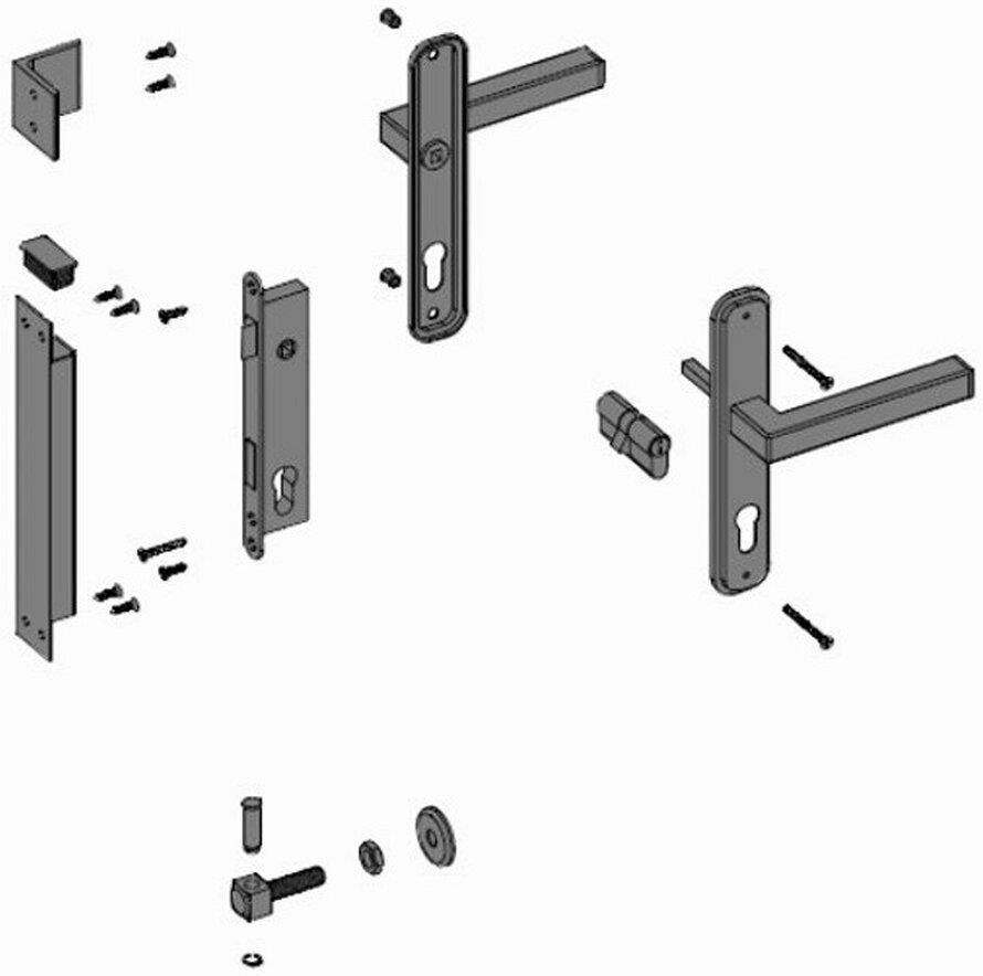 Jarmex ocynkowane akcesoria do furtki panelowej W zestaw wchodzą: - 1 x opór furtki (ogranicznik) - 1 x kaseta do przykręcania - 1 x zaślepka wewnętrzna 40 x 20 mm - 1 x zamek do furtki wąski, rozmiar 90 mm - 1 x wkładka 31 x 31 mm - 1 x klamka do furtki - 8 x wkręt samowiercący do montażu kasety …