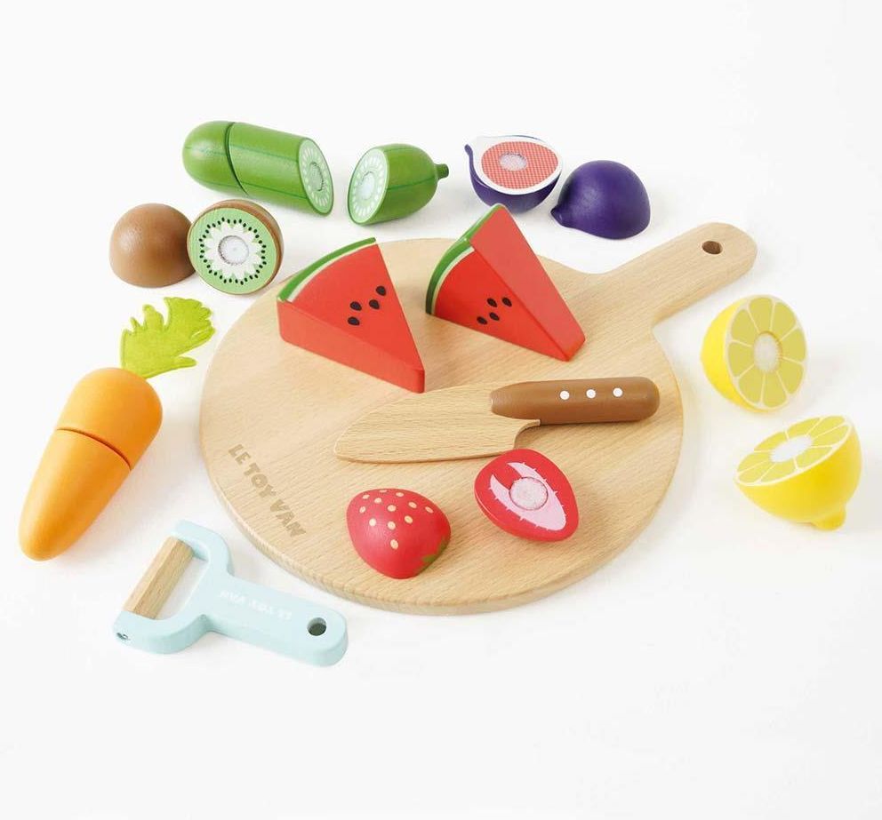 Ten niesamowity drewniany zestaw zawiera 18 elementów: deskę do krojenia, obieraczkę, nóż oraz 7 apetycznych owoców i warzyw, które można pokroić i składać w całość niezliczoną ilość razy, dzięki sprytnym ukrytym mocowaniom na rzep. Zabawka stanowi doskonały prezent, który wspiera umiejętności społeczne, poprawia zręczność i doskonali motorykę małą. Zestaw idealnie uzupełnieni zabawę w sklep, kawiarnię, stragan, a przede wszystkim przyda się w każdej kuchni. Drewniane warzywa i owoce do krojenia oferują Twojemu dziecku nowe scenariusze wspaniałej zabawy! Mali szefowie kuchni będą zachwyceni tym kolorowym zestawem zdrowych owoców i warzyw, które można kroić nieskończoną ilość razy! Ta niesamowita drewniana zabawka zawiera 18 elementów: deskę do krojenia, obieraczkę, nóż oraz 7 apetycznych owoców i warzyw, które można pokroić i składać w całość, dzięki sprytnym ukrytym mocowaniom na rzep. Realistycznie wykonane z solidnego drewna bukowego pozyskanego ze zrównoważonych zasobów FSC®, wszystkie elementy mają gładkie, bezpieczne dla dzieci krawędzie i zostały pomalowane przy użyciu nietoksycznych farb na bazie wody z bardzo starannym odwzorowaniem detali dla realistycznej zabawy i radości Twojego dziecka. Ta wysokiej jakości zabawka inspiruje do długich godzin kreatywnej aktywności. Zestaw świetnie się sprawdzi jako dodatek do sklepu, straganu oraz kuchni marki Le Toy Van sprzedawanych osobno. Wszystkie zabawki marki są tworzone, aby przetrwać lata. Zostały starannie zaprojektowane i wykonane przez wykwalifikowanych rzemieślników z wykorzystaniem etycznych praktyk i zrównoważonych materiałów. Specyfikacja: Przeznaczone dla dzieci w wieku od 2 lat Wymiary - deska do krojenia - S:16 x G:1 x W:22.5cm Zachęca do zabawy społecznej, rozwija wyobraźnię i zręczność Wykonane z drewna certyfikowanego przez FSC® Rzetelnie przetestowane, aby spełniać najwyższe standardy bezpieczeństwa Udekorowane przy użyciu farb na bazie wody, nietoksycznych. O marce Le Toy Van Misją brytyjskiej marki Le Toy Van jest tworzenie przepełnionych miłością, wyjątkowo pięknych zabawek, które przetrwają próbę czasu i dają naszym pociechom niezrównaną frajdę z zabawy. Zabawki Le Toy Van są wyjątkowe - wytwarzane z drewna i materiałów wyłącznie o zrównoważonym pochodzeniu, wykonane w zgodzie z najsurowszymi standardami europejskimi i amerykańskimi bezpieczeństwa dla dzieci. Marka sprzedaje swoje zabawki na całym świecie, a utalentowany zespół projektantów tworzy je i opracowuje w Wielkiej Brytanii. Firma współpracuje tylko z wykonawcami, którym przyświecają te same ideały i wciąż podnosi poprzeczkę w kwestiach jakości zabawek i standardów ich wykonania. Le Toy Van to marka wielokrotnie nagradzana za jakość, design, bezpieczeństwo, zaangażowanie w środowisko, a także wartość edukacyjną i atrakcyjność zabawy swoich produktów. Zabawki Le Toy Van „występują” w produkcjach wytwórni filmowej Disney, od lat zajmują zasłużone miejsce na szczytach rankingów Vogue, Forbes, GQ, New York Post, The Independent, Glamour i innych. Pomimo tak wielu nagród i wyróżnień Le Toy Van nie spoczywa na laurach i tworzy wciąż coraz lepsze zabawki, które przynoszą radość i magię zabawy dzieciom na całym świecie. Wszystkie zabawki marki Le Toy Van są zbadane w laboratoriach SGS pod kątem zgodności ze standardami ASTM, BS EN-71, EN-71, AUS i CCPSIA.
