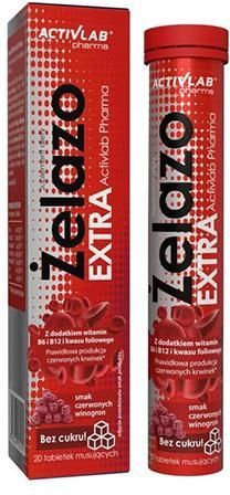 Żelazo Activlab Pharma to produkt, który uzupełnia dietę w łatwo przyswajalne żelazo i witaminy niezbędne do produkcji czerwonych krwinek. Składniki: Regulator kwasowości: kwas cytrynowy, substancja wypełniająca: sorbitole, regulator kwasowości: wodorowęglan sodu, aromat, koncentrat buraka czerwonego, kwas L-askorbinowy, diglicynian żelaza, substancja przeciwzbrylająca: glikol polietylenowy, diglicynian cynku, substancja słodząca: sukraloza, chlorowodorek pirydoksyny, diglicynian miedzi, kwas pteroilomonoglutaminowy, metylokobalamina. Zawartość 1 tabletki: Żelazo 14 mg (100%**) Witamina C 80 mg (100%**) Witamina B6 5 mg (357%**) Kwas foliowy 200 mcg (100%**) Witamina B12 10 mcg (400%**) Cynk 10 mg (100%**) Miedź 1 mg (100%**). **% referencyjnej wartości spożycia. Masa netto: 20 tabletek musujących. Właściwości: Żelazo Activlab Pharma uzupełnia dietę w łatwo przyswajalne żelazo i witaminy niezbędne do produkcji czerwonych krwinek (B6, B12). Zawiera dodatek kwasu foliowego, który pomaga w prawidłowej produkcji krwi. Ponadto witaminy B6, B12 przyczyniają się do zmniejszenia uczucia zmęczenia i znużenia. Miedź pomaga w prawidłowym transporcie żelaza w organizmie. Zalecane dzienne spożycie: 1 tabletkę rozpuścić w 200 ml wody. Stosować raz dziennie. Przeciwwskazania: Nadwrażliwość na którykolwiek ze składników preparatu. W okresie ciąży i karmienia piersią przed zastosowaniem należy skonsultować się z lekarzem lub farmaceutą. Przechowywanie: Przechowywać w temperaturze pokojowej, w suchym miejscu, w zamkniętym opakowaniu, w sposób niedostępny dla małych dzieci. Producent: Activlab Sp. z o.o. ul. Łany 6 32-700 Bochnia