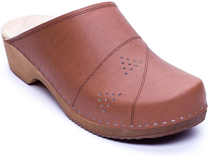 Chodaki męskie drewno topola bejcowane na brązowo, podbite gumką antypoślizgową. Skóra bydlęca kolor karmet plus przeszycie wentylacja