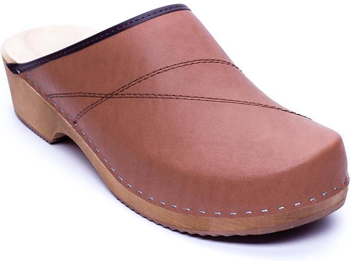 Chodaki męskie drewno topola bejcowane na brązowo, podbite gumką antypoślizgową. Skóra bydlęca kolor karmel z przeszyciami i lamówką brązową