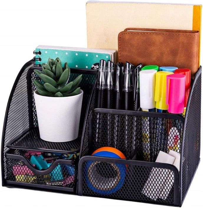 DUŻY PRZYBORNIK ORGANIZER NA BIURKO POJEMNY METALOWY 6 KOMÓR + SZUFLADKA Duży przybornik organizer na biurko pojemny metalowy 6 komór + szufladka Kluczowe Cechy Produktu Wszechstronność UżytkowaniaOrganizer idealnie sprawdzi się w domu, biurze czy pracowni. Możesz w nim przechowywać spinacze, kleje, nożyczki, długopisy, kredki, pisaki, gumki, karteczki i wiele innych niezbędnych akcesoriów. Duża PojemnośćLiczne przegródki oraz wysuwana szufladka pomieszczą wszelkie potrzebne przedmioty, umożliwiając utrzymanie porządku w miejscu pracy. Antypoślizgowe NóżkiOrganizer został wyposażony w antypoślizgowe nóżki, które zapobiegają przesuwaniu się pojemnika, zapewniając stabilność i wygodę użytkowania. Lekka i Trwała KonstrukcjaWykonany z wysokiej jakości metalowej siateczki, organizer jest lekki, a jednocześnie bardzo trwały. Solidna konstrukcja zapewnia długotrwałe użytkowanie. Organizer na biurko o lekkiej siateczkowej konstrukcji metalowej to doskonały wybór zarówno do domu, jak i biura. Dzięki niemu wszystkie niezbędne akcesoria szkolne i biurowe będą zawsze na swoim miejscu, zapewniając porządek i wygodę podczas pracy.