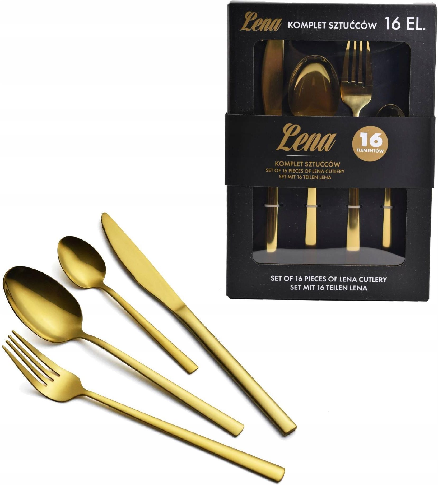 SZTUĆCE ZŁOTE ZESTAW SZTUĆCÓW KOMPLET DLA 4 OSÓB 16EL. HAUSMANN KOD PRODUKTU: 5905155005847 Karl Hausmann to szwajcarski projektant specjalizujący się w produkcji wyposażenia kuchennego ze stali nierdzewnej. Spotykają się tu innowacyjne wzornictwo i tradycyjna jakość. Szeroka gama produktów wykonanych ze stali nierdzewnej sprawia, że marka ta idealnie wpasuje się w każdą kuchnię. Precyzyjne wykonanie i dbałość o szczegóły oraz najwyższa jakość materiałów to główne cechy charakteryzujące wyroby marki Karl Hausmann. Zestaw sztućców dla 4 osób to idealny prezent na ślub, rocznicę czy inną uroczystość. Całość została zapakowana w eleganckie pudełko. Sztućce zostały wykonane z wysokiej jakości stali nierdzewnej, dzięki czemu mamy pewność, że posłużą nam przez długie lata. Dzięki jakości i wykonaniu, sprawują się niezawodnie! Sztućce zrobione są ze stali nierdzewnej wysokiej jakości. Zapakowany jest w eleganckie pudełko, dzięki czemu łatwo można utrzymać porządek. Nadaje się zarówno na prezent z okazji uroczystości, jak i do profesjonalnego użytku w punktach gastronomicznych. Sztućce można myć w zmywarkach, jednak zalecane jest mycie ręczne, by utrzymać dłuższą żywotność i jakość produktu. Kod produktu: 5905155005847 Producent: KARL HAUSMANN Model: Lena Materiał: Stal nierdzewna Wykończenie: Połysk Ilość elementów: 16 Ilość osób: 4 Zmywarka: Tak Opakowanie: Pudełko / oryginalne producenta SKŁAD KOMPLETU Noże stołowe - 4 szt Widelce stołowe – 4 szt Łyżki stołowe – 4 szt Łyżeczki do herbaty -4 szt Sztućce zostały wykonane z wysokiej jakości stali nierdzewnej znaczonej symbolem 18/0. Oznacza to, że nie zawiera niklu i jest bezpieczna dla osób uczulonych na ten pierwiastek. Z kolei 18 – procentowa zawartość chromu sprawia, że sztućce są odporne na korozję oraz charakteryzują się bardzo dużą trwałością. Jak dbać o sztućce ze stali nierdzewnej Niektóre produkty spożywcze mogą zawierać kwasy bądź inne substancje mogące reagować ze stalą. Dlatego bardzo ważne jest czyszczenie sztućców zaraz po użyciu. Unikaj długotrwałego namaczania. Grozi to powstaniem korozji. Do mycia korzystaj z delikatnych detergentów, które nie zawierają w swoim składzie wybielaczy cz chloru. Nie stosuj także płynów o zapachu pomarańczowym czy cytrynowym, ponieważ mogą one w swoim składzie zawierać kwasy odpowiedzialne za powstanie korozji. Umyte sztućce od razu wysusz. Długotrwały kontakt z wilgocią może powodować trwałe uszkodzenia. Oferujemy szeroki wybór sztućców marki Karl Hausmann. Zapraszamy do zapoznania się z naszymi aukcjami