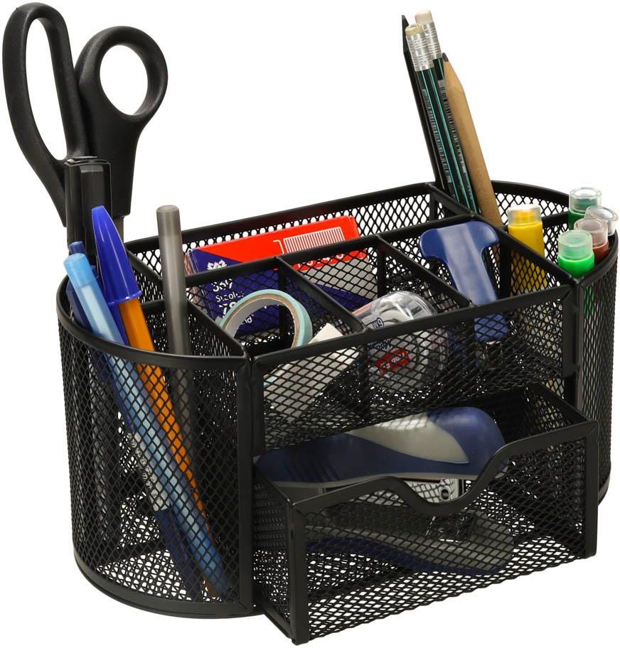 ORGANIZER NA BIURKO PRZYBORNIK BIURKOWY METALOWY 9 KOMÓR Czarny organizer biurkowy ułatwia zachowanie porządku – dziewięć przegródek umożliwia efektywne posegregowanie i uporządkowanie akcesoriów biurowych minimalistyczny wygląd – metalowa siatka w czarnym kolorze sprawia, że organizer sprawdzi się zarówno w pokoju ucznia, jak i w biurze nie tylko do biura – może służyć do przechowywania pędzli do makijażu, pomadek czy innych drobnych przedmiotów Parametry techniczne Tworzywo: metal Kolor: czarny Ilość komór: 9 Wymiary organizera: 22 cm x 11 cm x 10,2 cm Wymiary szuflady: 12,4 cm x 10,7 cm x 5,8 cm Wymiary opakowania: 23 cm x 12 cm x 11,5 cm Pożegnaj się z bałaganem na biurku! Z pomocą praktycznego organizera uporządkujesz swoje akcesoria, a na biurku w końcu zapanuje porządek. Dzięki dziewięciu przegródkom różnej wielkości z łatwością uporządkujesz długopisy, ołówki, nożyczki, spinacze i inne drobne przedmioty. Wysuwana szuflada doskonale się sprawdzi na karteczki samoprzylepne. Minimalistyczna forma organizera idealnie wkomponuje się w każde wnętrze. A dzięki siatkowej konstrukcji z łatwością dostrzeżesz wszystkie akcesoria. Organizer sprawdzi się również do organizacji innych przedmiotów: kosmetyków, małych narzędzi czy wszystkie innego co potrzebuje uporządkowania. Produkt zapakowany w kartonowe opakowanie.