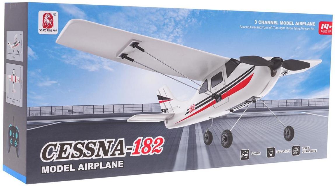 Opis Samolot CESSNA-182 R/C Zdalnie sterowany samolot Cessna-182 dla dzieci od 14-go roku życia i dorosłych. Samolot wykonano z lekkiego, a zarazem wytrzymałego, elastycznego, piankowego materiału EPP, z łatwością utrzymuje się w locie. Jest bardzo zwrotny i stosunkowo łatwy w pilotażu. Nadaje się do latania na zewnątrz. Samolot zasilany jest akumulatorem typu 3,7 V 300 mAh (w zestawie), pilot bateriami typu 4 x AA 1,5V (brak w zestawie). Funkcje myśliwca zdalnie sterowany 2,4 GHz, dla dzieci od 14-go roku życia i dorosłych, wykonany z lekkiego i wytrzymałego materiału EPP, odporny na uszkodzenia, łatwy w pilotażu, realistycznie wykonany, posiada oświetlenie, leci prosto, skręca w lewo, w lewo, robi korkociągi, żyroskop 6-osiowy, czas lotu ok. 20 minut. Wymiary - samolot ok. 33,8 cm x 12,6 cm x 43,6 cm, - opakowanie ok. 48 cm x 22,5 cm x 9,5 cm Zawartość zestawu samolot Cessna-182, pilot zdalnej kontroli, śrubokręt, akumulator 3,7 V 300 mAh, port do ładowania USB, zapasowe śmigło, instrukcja.