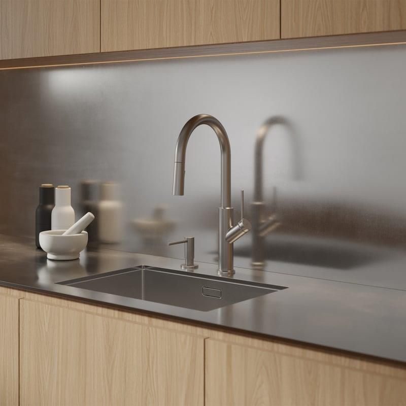 Bateria kuchenna OMNIRES BEND wyróżnia się piękną, minimalistyczną formą opartą na okręgach i łukach. Bateria o wysokości 44,4 cm wyposażona jest w obrotową, wyciąganą wylewkę z 2-funkcyjnym prysznicem, co zwiększa zasięg strumienia wody i wygodę użytkowania. Bateria została wykonana z …
