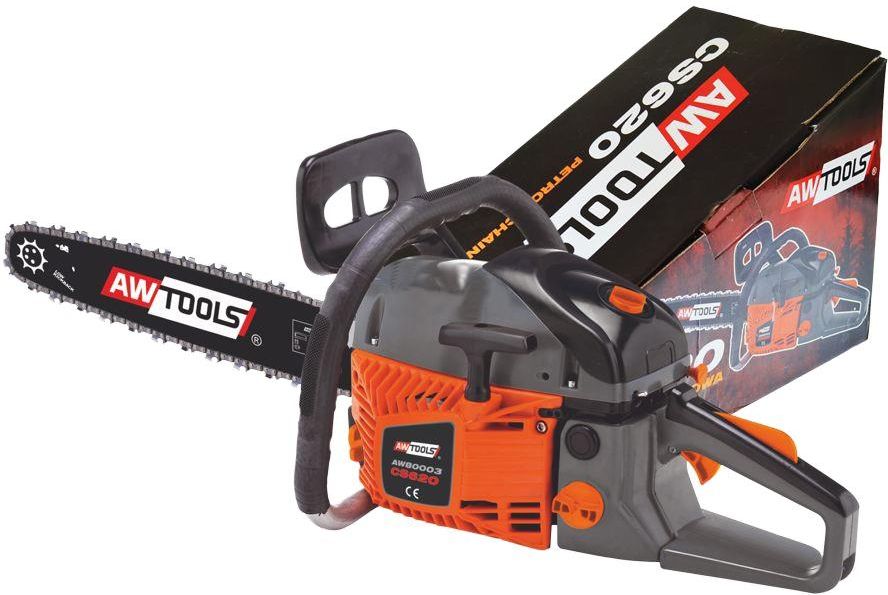 Napędzana 2-suwowym chłodzonym powietrzem silnikiem benzynowym uruchamianym przez linkę rozruchową. Prowadnica z wysokiej jakości hartowanej stali z łożyskiem i automatycznym system smarowania. Wyposażona w hamulec łańcucha oraz przednią osłonę dłoni. Obudowa wykonana z odpornego na uderzenia tworzywa sztucznego. Ergonomiczna, antypoślizgowa rękojeść zapewnia pewny chwyt. Wbudowane amortyzatory minimalizujące drgania. Osłona zabezpieczająca zapewnia bezpieczne i łatwe przechowywanie łańcucha i prowadnicy. Przeznaczona do wszelkich prac w ogrodzie, w gospodarstwie, na działce oraz na budowie. Dane techniczne: Moc silnika: 2,95 KW/ 4,0 KM 2-suw Pojemność: 62cc Obroty: 11000 obr./min. Mieszanka paliwowa: 1:25 Pojemność zbiornika paliwa: 550 ml Pojemność zbiornika oleju: 260 ml Długość prowadnicy: 16" (40cm) Podziałka łańcucha/ zębatki: 0,325” Łańcuch: .325/x66/16"/1.5mm (AW80109) Waga: 7,5kg