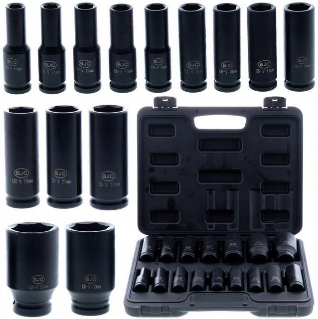 ZESTAW NASADEK UDAROWYCH BJC 10-32MM 1/2" W WALIZCE NASADKI REKOMENDOWANE PRZEZ SPECJALISTÓW ZARÓWNO DO DOMOWEGO UŻYTKU JAK I PROFESJONALNEGO ZASTOSOWANIA Najpopularniejsze rozmiary sześciokątnych nasadek powodują, że zestaw doskonale poradzi sobie z wykonywaniem wielu prac serwisowych i warsztatowych bez problemu dostając się do głębokich gniazd śrub Nasadki kompatybilne są z połączeniami kulkowymi (również z pierścieniem) pasują do kluczy pneumatycznych, krzyżakowych czy przekładniowych Dodatkowo posiadają otwory ustalające dla kluczy z blokadą nasadki, co w pełni stabilizuje klucz w gnieździe i zapobiega spadaniu nasadki NASADKI BJC TO GWARANT JAKOŚCI NIE INACZEJ JEST Z ZESTAWEM 1/2", KTÓRY SPEŁNIA NORMY NAJWYŻSZYCH KLAS DOKŁADNOŚCI UNIWERSALNY ZESTAW NA DŁUGIE LATA Nasadki wykonane zostały metodą kucia na gorąco z bardzo dobrej stali chromowo-molibdenowj, dodatkowo wzmocnionej metodą wytwarzania, dzięki czemu wykazują one doskonałe właściwości takie jak odporność na zużycie, korozję, rozciąganie czy wysokie temperatury Przemyślany kształt nasadek pozwala przenosić dużą siłę obrotową, co sprawia, że łatwo osiągnąć optymalną siłę dokręcania i ograniczyć straty energii zwiększając tym samym efektywność pracy PROFESJONALNY ZESTAW ZŁOŻONY Z 16 NASADEK W NAJPOPULARNIEJSZYCH ROZMIARACH 10mm 11mm 12mm 13mm 14mm 15mm 16mm 17mm 18mm 19mm 21mm 22mm 24mm 27mm 30mm 32mm