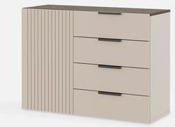 Komoda CREMONA uzupełni brakujące miejsce w szafie, oferując dodatkowe miejsce na ubrania, bieliznę czy drobne dodatki. Na blacie ustawisz dekoracje lub misę na klucze domowników. Szuflady zostały wyposażone w prowadnice quadro, które zwiększają stabilność i wydłużają sprawność. Nowoczesne meble do przedpokoju i sypialni Urządź spójną i funkcjonalną sypialnię lub przedpokój z kolekcją CREMONA. Meble w odcieniu stone grey to delikatny, beżowy odcień. W połączeniu z ciemnymi elementami w odcieniu dębu windmill stworzą ciepłe i nowoczesne wnętrze. Ryflowanie na części frontów przełamie gładkie powierzchnie, przyciągając uwagę domowników i gości. Długie, metalowe uchwyty wykończone w ciemnym kolorze optycznie wydłużą pomieszczenie.