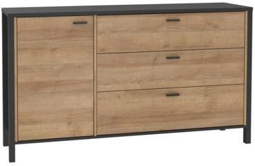 Urządzasz mieszkanie w industrialnym stylu? Kolekcja mebli HIGH ROCK to połączenie dekoru dąb riviera z pełną głębi czernią, która przyciągnie Twoją uwagę. Duża ilość miejsca do przechowywania umożliwi funkcjonalne rozplanowanie wnętrza salonu, jadalni czy domowego biura. Możesz uporządkować w niej ubrania, zastawę stołową czy dokumenty. Blat pozwoli Ci wyeksponować stylowe dekoracje lub ulubione pamiątki. WNĘTRZE Komoda posiada 1 zamykaną szafkę oraz 3 szuflady, wyposażone w prowadnice kulkowe. WYKOŃCZENIE Komoda HIGH ROCK została wykonana z płyty meblowej oraz wykończona laminatem i folią; Fronty komody pokryte są folią w kolorze dąb riviera; Blat wykończony jest płytą laminowaną w czarnym kolorze, a półki płytą foliowaną w barwie dąb riviera; Komoda została wyposażona w czarne, metalowe uchwyty orazramy z płyty MDF przechodzące w nogi, co dodatkowo podkreśla industrialny charakter wnętrza; Powierzchnię płyty laminowanej oraz foliowanej bardzo łatwo utrzymać w czystości – wystarczy użyć miękkiej, zwilżonej ściereczki. Meble z kolekcji HIGH ROCK pomogą stworzyć wyjątkowy, loftowy klimat w Twoim mieszkaniu. Świetnie będą się prezentować przy ścianie z czerwonej cegły.