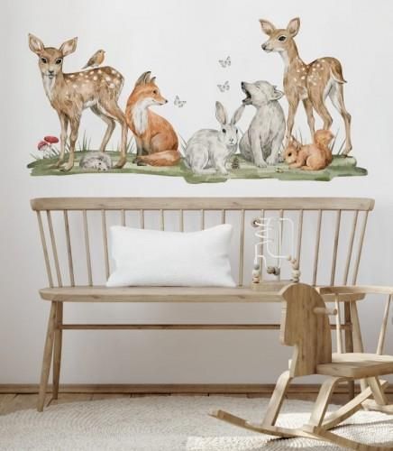 Zestaw dziecięcych naklejek ze zwierzętami, zawierający sarny, lisa, zająca, wiewiórkę, wilczka i rośliny. W tej cenie kupujecie Państwo następujące elementy:2 jelonki, jeża, wiewiórkę, szyszkę, żołędzia, 2 muchomory, ptaszka, zajączka, lisa, wilczka, 3 motylki, 2 kępki trawy Naklejka stado małych jeleni jest dostępna w wymiarach:• XL mieszczący się w powierzchni 95 x 237 cm• L mieszczący się w powierzchni 95 x 130 cm• M mieszczący się w powierzchni 95 x 58 cm Nasze naklejki drukowane są na białej, matowej lub błyszczącej folii. Wycinanie po obrysie gwarantuje, że poszczególne elementy pozostają bez tła. Aby umożliwić łatwą aplikację do ściany, produkowane przez nas nalepki pokryliśmy papierem transportowym. Wizualizacje są jedynie prezentacją naklejek, mogą nie oddawać rzeczywistego wymiaru. Przed zakupem prosimy o sprawdzenie odpowiedniego rozmiaru. Pamiętaj również, że istnieją różnice w obrazie drukowanym, a tym, który widzisz na ekranie.