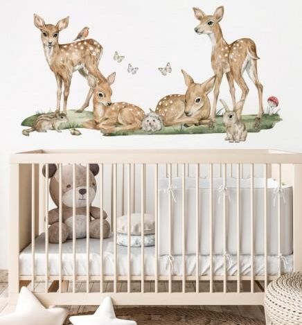 Urocza naklejka na ścianę z leśnymi zwierzętami. W zestawie znajdują się jelenie, zając, motyle i wiewiórka. W tej cenie kupujecie Państwo następujące elementy:4 jelonki, jeża, wiewiórkę, 2 szyszki, muchomora, ptaszka, zajączka, 2 kępki trawy Naklejka stado małych jeleni jest dostępna w wymiarach:• …