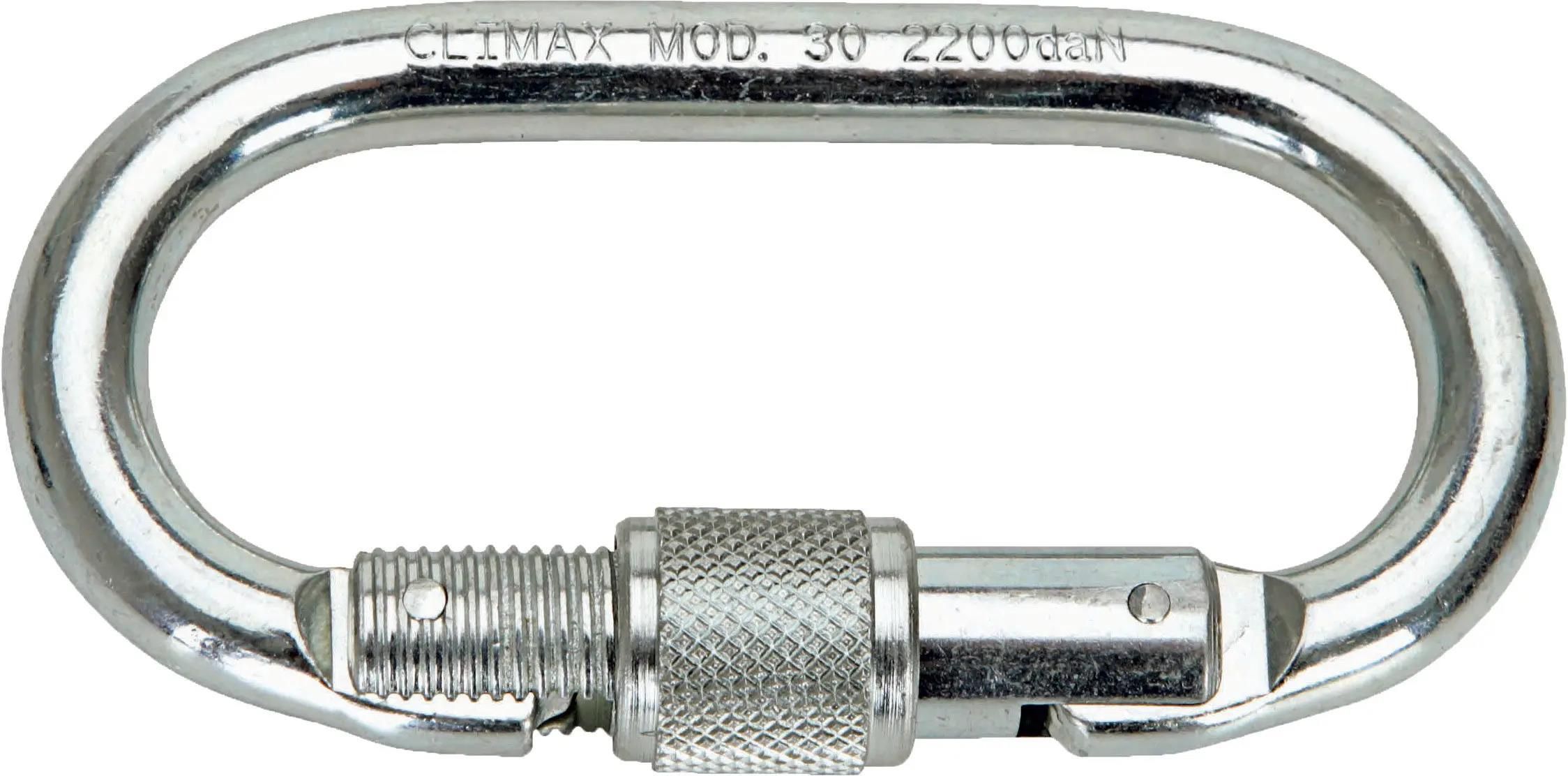 Stalowy karabińczyk z zamkiem gwintowym oraz sprężyną automatycznie domykającą ramię zamka. Niezbędny do podłączenia całego systemu do pracy na wysokości jak i pojedynczych elementów. (Kąt rozwarcia - 16mm), waga 176 g.