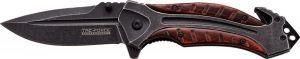 Nóż sprężynowy Długość w stanie zamkniętym 127 mm Ostrze 83 mm ze stali nierdzewnej, grubość 3 mm, kamionkowe wykończenie Uchwyt ze stali nierdzewnej z wstawkami z drewna pakka Nóż do pasów bezpieczeństwa Wybijak do szyb Kieszonkowy klips