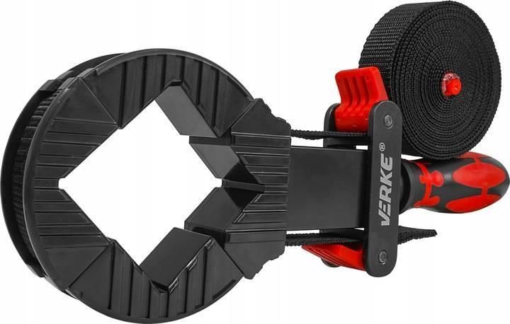 Taśmowy ścisk stolarski umożliwia docisk klejonych elementów o dużych rozmiarach (w tym modelu do 4 metrów w obwodzie) z zachowaniem kąta 90 stopni. Narzędzie nadaje się do klejenia ram, blatów, skrzynek, przy konstrukcji stolików, itp.