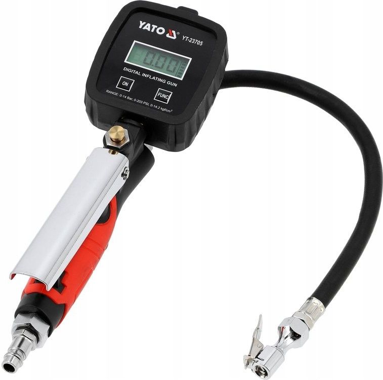 Pistolet do pompowania kół z cyfrowym panelem sterowania łączy precyzyjny układ pomiarowy z ergonomiczną konstrukcją. Urządzenie sterowane jest za pomocą panelu elektronicznego z czytelnym wyświetlaczem LCD, który umożliwia nastawę i odczyt żądanej wartości ciśnienia oraz śledzenie procesu pompowania w czasie rzeczywistym. Konstrukcja i funkcje użytkowe zostały zaprojektowane pod kątem niezawodności i bezpieczeństwa pracy. Pistolet jest wyposażony w standardowe przyłącze powietrza i wąż o długości 40 cm zapewniający odpowiedni zasięg. Niewielkie wymiary manometru 80 x 78 mm ułatwiają montaż i odczyt nawet w ciasnych przestrzeniach. Parametry: cyfrowy panel sterowania z wyświetlaczem LCD przyłącze powietrza: standard zakres pomiaru: 0-14 bar maks. ciśnienie robocze: 1,2 MPa (~ 12 bar) tolerancja pomiaru ±0,14 bar wskazuje na powtarzalność odczytu w warunkach roboczych niskie drgania wąż o długości 40 cm zapewnia optymalny zasięg i poręczność wymiary manometru: 80 x 78 mm waga: 0,5 kg