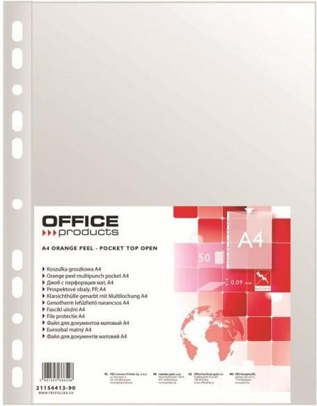 KOSZULKI NA DOKUMENTY OFFICE PRODUCTS, POSZERZANE, PP, A4, GROSZKOWE, 90MIKR., 50SZT. wykonane z miękkiej folii polipropylenowej o grubości 90μm posiada Zielony Punkt (Der Grüne Punkt) - udział w systemie recyklingu i odzysku odpadów wynikający z przepisów prawa polskiego i UE groszkowe, transparentne otwarte na górze antyelektrostatyczne odpowiednie do dokumentów w formacie A4 ilość dziurek do wpięcia: 11 rozmiar: zewnętrzny 238x304 mm, wewnętrzny: 220x300mm wersja poszerzana, polecana do archiwizacji dużej ilości kartek (min. 110) i katalogów 50 sztuk w j.s. kolor transparentny OPIS MARKI OFFICE PRODUCTS: Jest ekonomiczną marką własną firmy PBS Connect Polska. Powstała jako odpowiedź na zmiany na rynku artykułów biurowych, papierniczych i szkolnych – głównie w kontekście poszukiwań produktów ekonomicznych, przy zachowaniu określonego poziomu użytkowego. Marka oferowana jest w konkurencyjnych cenach, jednak z zachowaniem standardów jakościowych. OPIS KATEGORII KOSZULKI I OBWOLUTY: Koszulki są praktyczne i funkcjonalne. Nie może ich zabraknać w żadnym domu, biurze czy też szkole. Przechowujemy w nich różne ważne i mniej istotne dokumenty, świadectwa, zdjęcia, pamiątki, notatki, płyty cd, wizytówki itp. Występują w rozmiarach A4 oraz A5. Jedni lubią koszulki krystaliczne inni groszkowe z większą ilością mikronów i mniejszą. Mogą być najbardziej klasyczne czyli otwierane od góry typ U lub otwierane z boku typ L. Dostępne są również koszulki poszerzane oraz z klapką. Możliwości jest wiele. Dostępne są w opakowaniach kartonowych jak również zapakowane są w folii. Twardszą, mocniejszą alternatywą do klasycznych koszulek są obwoluty, które możemy zakupić w różnych wariantach kolorstycznych. Nasza kategoria związana jest z grupami produktów najczęściej określanych jako: koszulki krystaliczne, koszulki groszkowe, koszulki a4 i a5 na dokumenty, obwoluty na dokumenty, koszulki foliowe