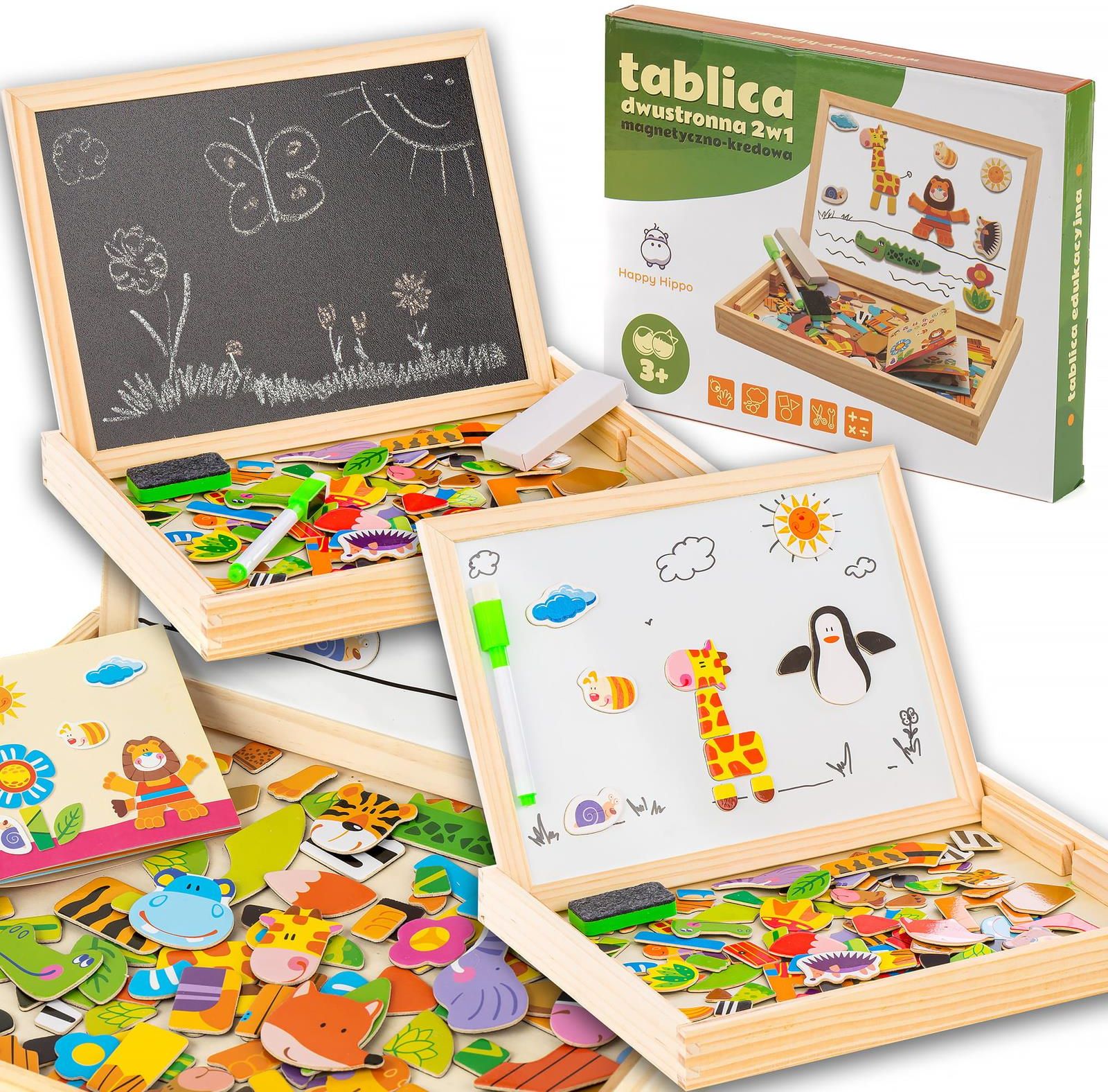 Tablica Kredowo Magnetyczna Edukacyjna dwustronna Tablica Edukacyjna Dwustronna Happy Hippo – Kreatywna Nauka i Zabawa Rysuj, zmazuj, przyklejaj i koloruj – z tablicą edukacyjną Happy Hippo każda chwila zamienia się w pełną kreatywności zabawę! To połączenie tradycyjnej tablicy kredowej oraz magnetycznej suchościeralnej, które rozwija wyobraźnię, zdolności manualne i umiejętność koncentracji dziecka. Idealna zarówno do nauki pisania i liczenia, jak i do spontanicznych artystycznych zabaw w domu. Dwustronna Tablica – Dwa Sposoby na Zabawę Strona Kredowa Ta strona tablicy pozwala tworzyć kolorowe rysunki, zapisywać równania, ćwiczyć litery i liczby – zupełnie jak w prawdziwej szkole! Wystarczy kreda i odrobina wyobraźni, aby przenieść się w świat kreatywnej nauki. Po zakończonej zabawie wystarczy przetrzeć powierzchnię gąbką i rozpocząć nowe dzieło. Strona Magnetyczna Umieść na niej kolorowe magnesy z zestawu i stwórz ciekawą historyjkę lub zagraj w kalambury. Tablica suchościeralna pozwala rysować markerem, zmazywać i rysować ponownie – bez końca! To świetna zabawa, która rozwija wyobraźnię przestrzenną i zachęca do wspólnego spędzania czasu z rodziną. Specyfikacja Dwustronna tablica – magnetyczno-kredowa Producent: Happy Hippo Certyfikat CE Rama i podstawa wykonane z trwałego drewna Zawartość Zestawu Tablica dwustronna Happy Hippo Kolorowe magnesy Kredy Pisak suchościeralny Gąbka do czyszczenia Kolorowa książeczka z przykładowymi układankami Estetyczne, kolorowe opakowanie – idealne na prezent Wymiary Złożonej Tablicy Długość: 31 cm Szerokość: 23 cm Wysokość: 4 cm Idealny Prezent dla Małych Artystów Tablica edukacyjna Happy Hippo to doskonały wybór dla dzieci, które lubią rysować i tworzyć. Rozwija zdolności manualne, kreatywność oraz uczy porządku poprzez zabawę. Bezpieczna konstrukcja, drewniana rama i certyfikat CE gwarantują wysoką jakość i trwałość. Sprawdzi się jako prezent na urodziny, Dzień Dziecka, Święta lub po prostu jako codzienny towarzysz nauki i zabawy. Słowa kluczowe: tablica edukacyjna, tablica dwustronna, tablica magnetyczna, tablica kredowa, tablica Happy Hippo, nauka i zabawa, kreatywna zabawka, tablica dla dzieci, prezent dla dziecka, zestaw artystyczny.