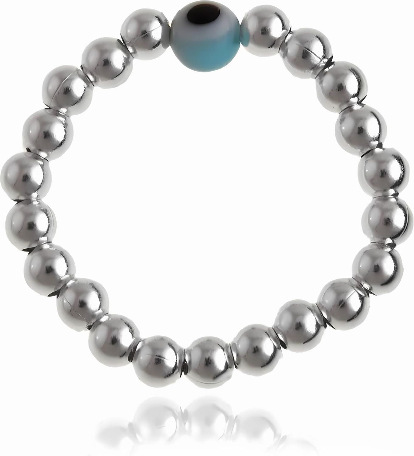 Delikatny wykonany z nawleczonych na rozciągliwą żyłkę jubilerską gładkich kuleczek z kryształową ozdobą przypominającą oko proroka. Pierścionek jest elastyczny, dzięki czemu z powodzeniem, mogą nosić go osoby noszące pierścionki w zakresie rozmiarów 10 - 13.