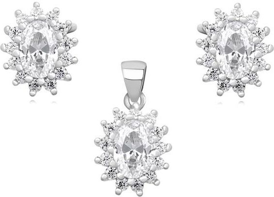 Elegancki, wykonany z rodowanego srebra komplet, składający się z kolczyków na sztyfcie oraz wisiroka, zdobiony centralnie umieszczoną owalną białą cyrkonią otoczoną mniejszymi białymi cyrkoniami, model Z1102K_W.