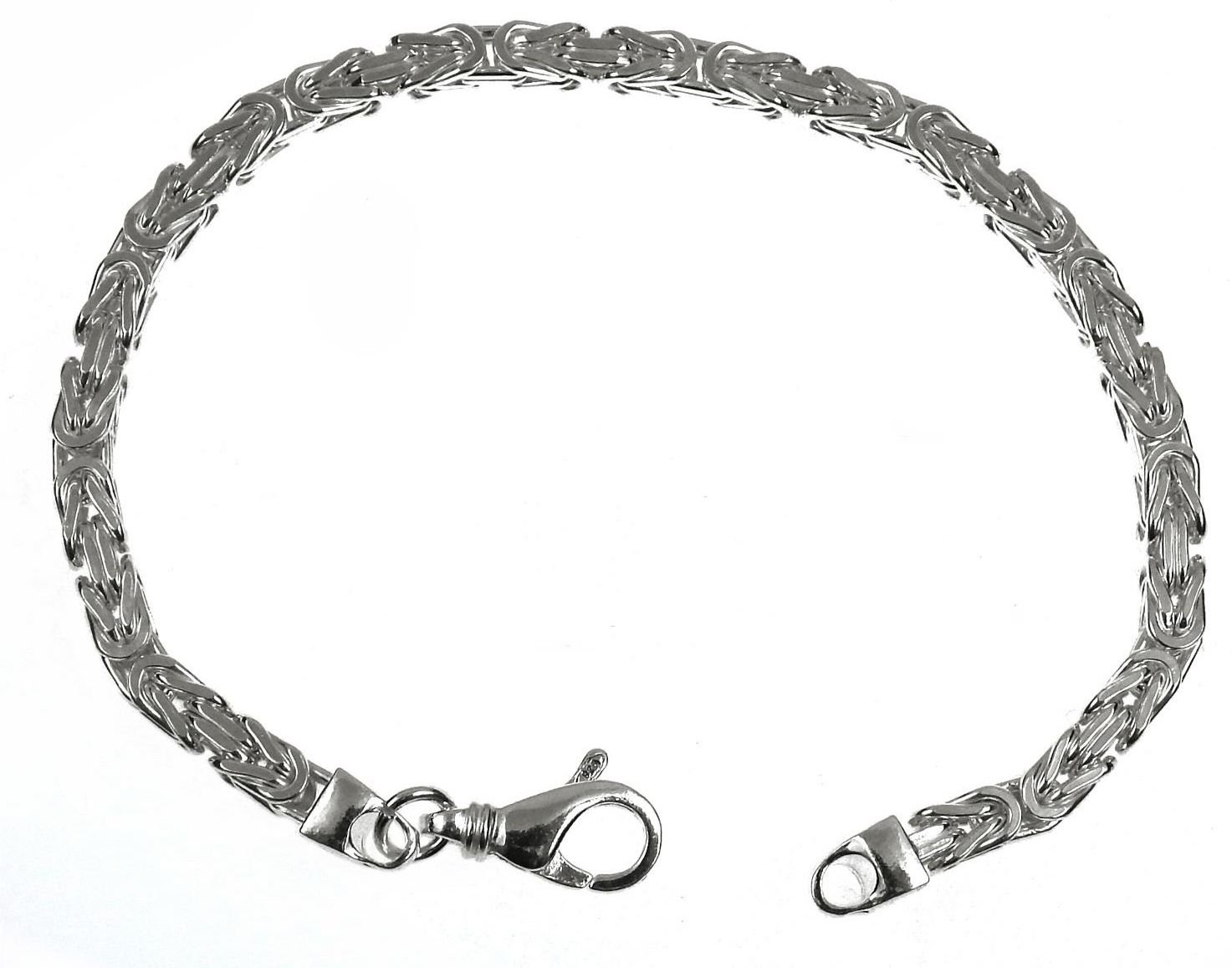 Elegancka wykonana ze srebra bransoleta o szlifowanym splocie królewskim o grubości 4,2 mm. Łańcuszek ma czworokątny przekrój, a jego ogniwa są pełne w środku.