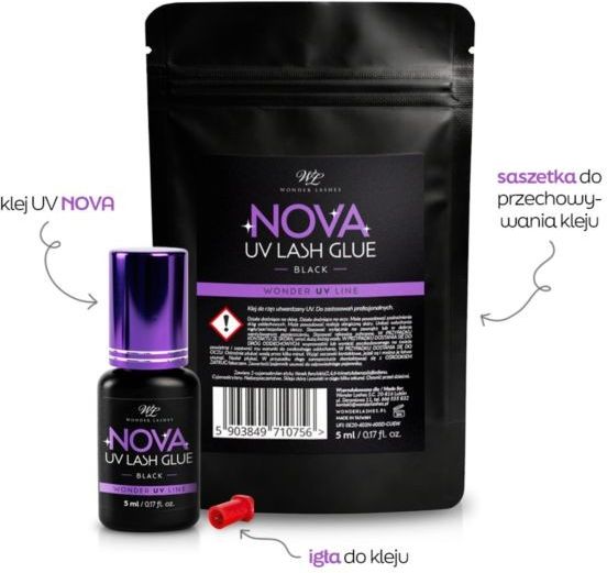 NOVA klej UV do przedłużania rzęs NOVA UV Lash Glue - nowa era trwałości w stylizacji rzęsKLEJ UV DO PRZEDŁUŻANIA RZĘS NOVA – PRECYZJA, STABILNOŚĆ, KONTROLA Profesjonalny klej UV do przedłużania rzęs, przeznaczony do pracy z lampą UV LED. Wiąże dokładnie wtedy, kiedy chcesz – po naświetleniu, bez wpływu wilgotności i temperatury w salonie w ciągu 0,5-1sekundy. Idealny dla stylistek, które chcą pracować spokojnie, dokładnie i bez pośpiechu. Klej NOVA to czarny, ultra-trwały klej stworzony z myślą o profesjonalnej stylizacji rzęs metodą UV. Zapewnia natychmiastowe wiązanie, perfekcyjną kontrolę aplikacji oraz niezrównaną retencję od 8-10tygodni, niezależnie od warunków w jakich pracujesz. Sprawdza się w każdej temperaturze i wilgotności. DLACZEGO KLEJ UV? W przeciwieństwie do klasycznych klejów cyjanoakrylowych, klej UV: nie reaguje na wilgotność i temperaturę, wiąże dopiero wtedy, gdy chcesz – po naświetleniu lampą UV LED, (zakres 365-410nm). daje maksymalną precyzję aplikacji, nawet przy trudnych klientkach. CO ZYSKUJESZ Z KLEJEM NOVA UV? wiązanie dopiero po naświetleniu lampą UV LED brak „kaprysów” zależnych od warunków w salonie większy komfort pracy przy stylizacjach klasycznych i objętościowych stabilną, trwałą aplikację rzęs brak wpływu wilgotności i temperatury więcej czasu na idealne ustawienie rzęsy spokojniejszą, bardziej przewidywalną pracę czystsze i trwalsze aplikacje To klej, który ułatwia pracę, a nie ją utrudnia. DLA KOGO JEST TEN KLEJ? dla doświadczonych stylistek rzęs, dla osób pracujących systemem UV LED, dla stylistek, które chcą podnieść jakość i powtarzalność swoich stylizacji, do pracy w salonach, gdzie warunki są zmienne (sezonowość, klimatyzacja, ogrzewanie). Skład: Ethyl Cyanoacrylate PMMA - Polymethyl Methacrylate n-Butyl 2-Cyanoacrylate Phenyl bis(2,4,6-trimethylbenzoyl)-phosphine oxide CI 77266 Carbon Black - barwnik SPECYFIKACJA PRODUKTU Kolor - Czarny Czas wiązania - 0,5 - 1 sek. Retencja - 8-10 tygodni Oparowość - niska Wilgotnośc pracy - dowolna Rodzaj: klej UV do przedłużania rzęs Długość fali: 365-410nm Pojemność: 5 ml Utwardzanie: lampa UV LED Zastosowanie: profesjonalneWAŻNE !!Produkt przeznaczony do pracy z lampą UV LED Tylko do użytku profesjonalnego oraz wymaga znajomości techniki stylizacji rzęs metodą UV⭐ DLACZEGO WARTO KUPIĆ W WONDER LASHES? specjalizujemy się w produktach dla stylistek rzęs i brwi oferujemy wyłącznie sprawdzone, profesjonalne rozwiązania realne wsparcie po zakupie Wonderlashes 5903849710756