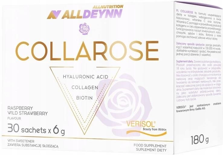 ALLDEYNN COLLAROSE Saszetka 6g x 30 sztuk PEPTYDY KOLAGENOWE VERISOL® DLA GŁADKIEJ I ELASTYCZNEJ SKÓRY BIOTYNA DLA WSPARCIA SKÓRY I WŁOSÓW WITAMINA C DLA LEPSZEJ PRZYSWAJALNOŚCI KOLAGENU I ZDROWEGO UŚMIECHU VERISOL WZMACNIA WŁOSY I PAZNOKCIE AŻ 50 PORCJI W OPAKOWANIU EFEKTY POTWIERDZONE BADANIAMI …