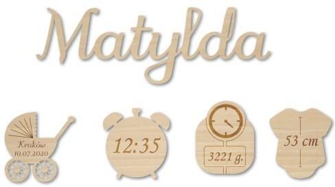 Deku - Zestaw z danymi metrycznymi - 5 elementów 000089 5 elementów z danymi metrycznymi: imię do wyboru, miejsce i data urodzenia, godzina, waga oraz wzrost. Elementy wykonane są ze sklejki o grubości 3 mm z litego drewna. Na każdym elemencie znajdują się wygrawerowane laserem CNC spersonalizowane dane. Ciekawy i cieszący się dużą popularnością produkt, który oczywiście możesz spersonalizować na własny sposób oraz dołączyć do czego tylko chcesz. Mogą znajdować się na niej takie informacje jak: imię, data urodzin, imienin, wiek, waga, wzrost, godzina narodzin, imiona rodziców, imiona chrzestnych, grupa krwi i inne. Elementy można przykleić samodzielnie lub zamówić u nas dodatkowo gotowy produkt. W celu personalizacji prosimy o wcześniejszy kontakt, bądź zostawienie informacji w uwagach do zamówienia. Specyfikacja: 5 elementów: imię do wyboru, miejsce i data urodzenia, godzina, waga oraz wzrost.