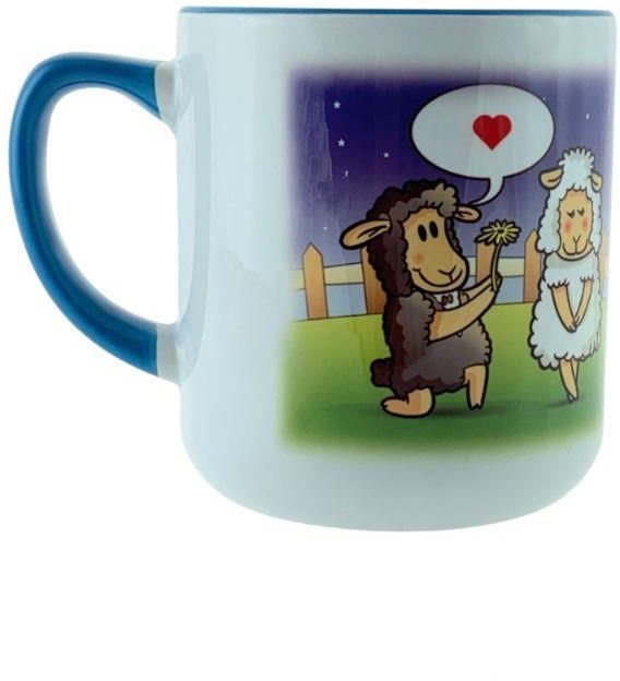 Kubek z niebieskim wnętrzem i niebieskim uchem, z nadrukiem dwóch owieczek i napisem: Miłość wszystkiemu wierzy . Materiał: ceramika Wysokość: 100 mm Średnica górna/dolna: 85/80 mm