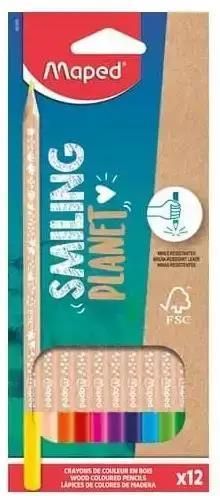 Kredki ołówkowe Smiling Planet od MAPED Prezentujemy kredki ołówkowe Smiling Planet, stworzone w 100 % z drewna FSC. Ciało ołówka o trójkątnym przekroju jest zdobione wzorami, co nadaje im unikalnego charakteru. Te kredki wyróżniają się także miękkim grafitem, który jest odporny na kruszenie i pęknięcia, co gwarantuje długotrwałe i nienaganną jakość rysunku. Grafit ma średnicę 2,9 mm. Prezentowany produkt to zestaw o różnej kolorystyce, składający się z 12 kredek. Smiling Planet to ekologiczna linia produktów z certyfikatem FSC. Szanujemy Ziemię – innowacyjne podejście do produkcji Tradycyjny plastik w kredek Smiling Planet od firmy MAPED został zastąpiony specjalnym kompozytem drewna i tworzywa. Jest to surowiec naturalnego pochodzenia, charakteryzujący się zaawansowanym, przyjaznym dla środowiska profilem, dzięki znacznemu zmniejszeniu udziału sztucznego tworzywa w produkcie na rzecz naturalnych wiórów drzewnych. Kolory natury w twoim pokoju Kolekcja kredek Smiling Planet jak i opakowań jest utrzymana w tonacji kolorystycznej nawiązującej do naturalnych barw, co jeszcze bardziej podkreśla jej ekologiczny charakter. EAN: 3154148318002