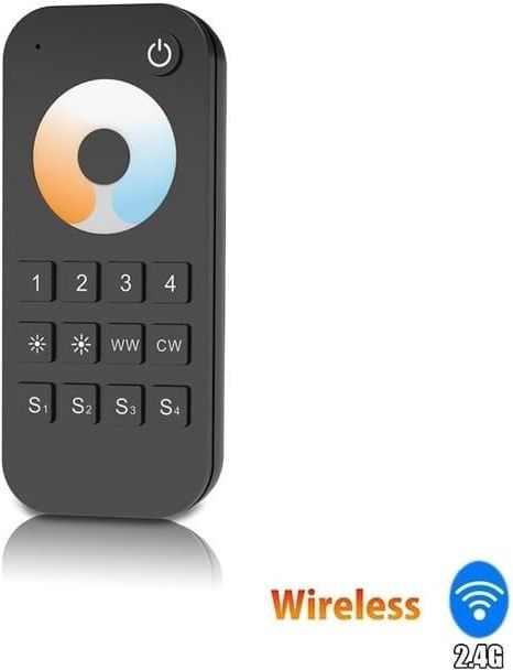 Pilot RT7 - bezprzewodowe sterowanie taśmą LED CCT w 4 strefach RT7 to wysokiej jakości bezprzewodowy pilot z dotykową tarczą zmiany temperatury barwowej oświetlenia multi white (np. taśmy LED CCT). Oferowany pilot przeznaczony jest do współpracy z odbiornikami CCT sterującymi temperaturą barwową światła białego. Komunikacja pilota z odbiornikiem LED CCT odbywa się drogą radiową 2,4GHz. Czuła tarcza pilota zapewnia intuicyjną i prostą zmianę barwy od ciepłej poprzez neutralną do zimnej. Pilot ten pozwala także na płynną regulację jasności oświetlenia. Jego obudowa charakteryzuje się nowoczesną obudowa w kolorze czarnym. Napięcie zasilania 3V DC (2 x bateria AAA). W zestawie uchwyt mocujący z magnesem. Gwarancja 5 lat. Producent SKYDANCE. Cechy pilota RT7 SKYDANCE • do zastosowania w oświetleniu o zmiennej temperaturze barwowej• możliwość sterowania czterema strefami• zasilanie: dwie baterie AAA• intuicyjna, dotykowa tarcza zmiany barwy CCT od ciepłej do zimnej • mechaniczne przyciski do szybkiego sterowania oświetleniem• możliwość zapisu 4 scen• komunikacja radiowa o zasięgu do 30 metrów z możliwością autotransmisji• możliwość przypisania nieograniczonej liczby odbiorników• funkcjonalny uchwyt naścienny w zestawie• nowoczesny wygląd i wysoka jakość wykonania• zgodność z certyfikatem EU-RED• gwarancja 5 lat Funkcje pilota RT7 Dlaczego warto kupić ten pilot? Pilot bezprzewodowy RT7 jest estetyczny i zapewnia intuicyjne sterowanie odbiornikiem LED w czterech strefach oświetlenia o zmiennej temperaturze barwowej CCT. Posiada on funkcjonalną dotykową tarczę zmiany barwy (ciepłej / neutralnej / zimnej) i mechaniczne przyciski szybkiego dostępu do innych parametrów oświetlenia. W zestawie z dostępnymi u nas odbiornikami CCT zapewni Państwu odpowiedni nastrój otoczenia. Płynna regulacja ściemniania będzie komfortowa dla naszych oczu. Oferowany pilot zmiany barwy CCT akceptuje nieograniczoną ilość odbiorników. Zasięg jego działania w wolnej przestrzeni to 30m. Urządzenie posiada certyfikat EU-RED i jest objęte 5 letnią gwarancją. Zapraszamy do zakupów. Zobacz film, żeby zobaczyć jak sterować pilotem RT7