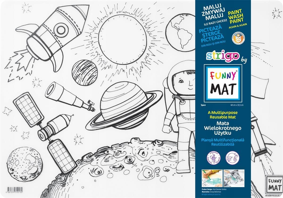 Transparentna mata Strigo by Funny Mat Space 48 x 33,5 cm + flamastry Szukasz wyjątkowego produktu, który nie tylko rozbawiTwojedziecko, ale także zapewni mu edukacyjną rozrywkę? W takim razie witamy Cię w kolekcji "Strigo Funny Mat" - rewolucyjnych podkładkach, które bawią, uczą i chronią! …