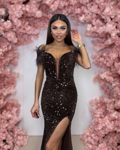 Zjawiskowa długa sukienka z rozporkiem eksponującym nogę. Kreacja uszyta jest z rozciągliwego materiału dzięki czemu idealnie dopasowuje się do sylwetki. Całość ozdobiona jest mieniącymi się cekinami. Góra sukienki posiada wszyte miseczki . Dekolt ozdobiony jest prześwitującą siateczką. Opadające …