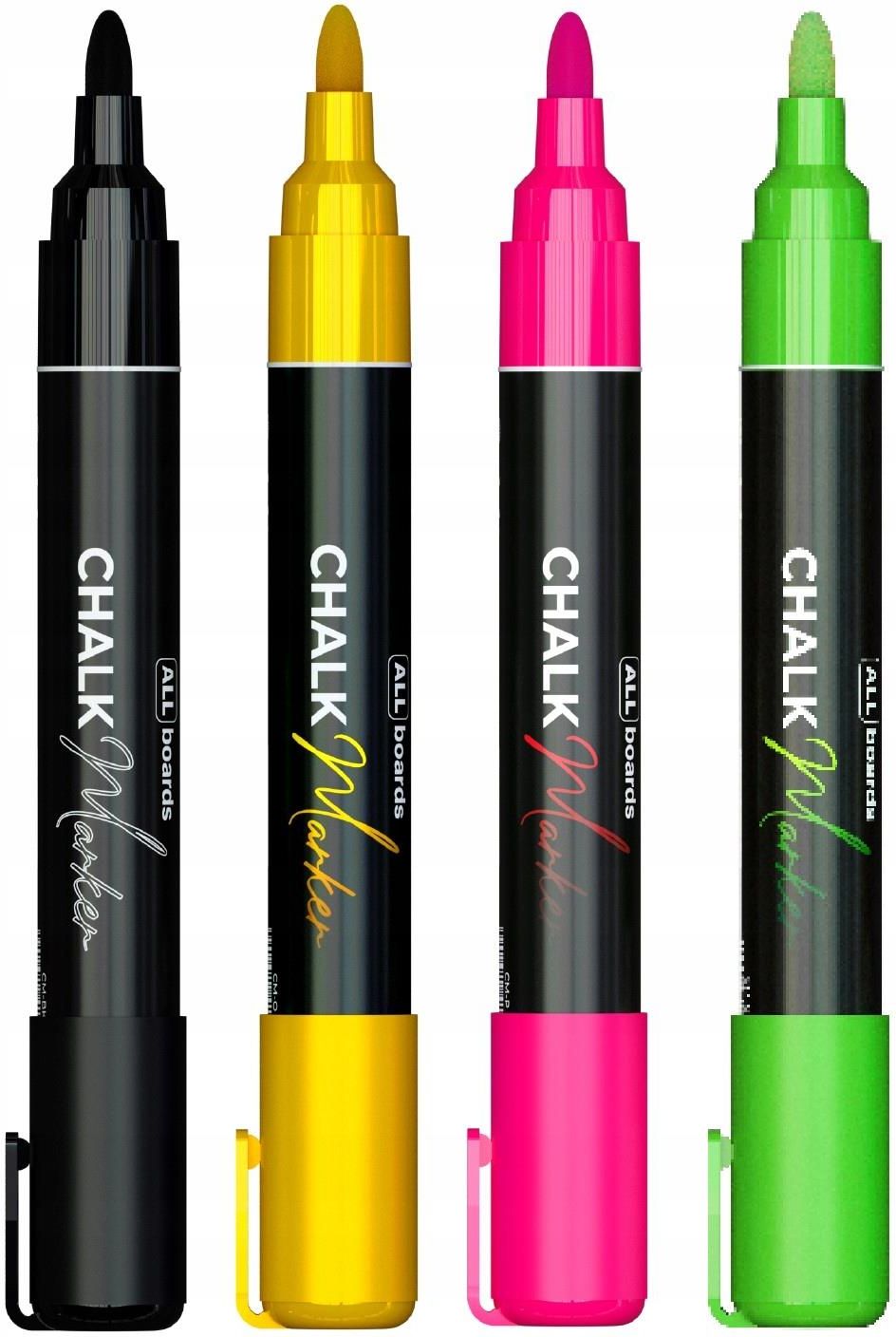 Zestaw markerów kredowych: różowy, zielony, biały, niebieski 4 markery kredowe kolory: różowy, zielony, biały, niebieski płynny tusz kredowy, niepylący idealne do tablic szklanych idealne do tablic kredowych - w tym przypadku łatwo się zmywa przy pomocy np. zwilżonej ściereczki Wysokiej jakości markery kredowe idealne dla różnego rodzaju tablic. Tusz który został użyty w markerach ALLboards jest niepylący, dzięki czemu bezpiecznie mogą ich używać nawet dzieci. Struktura chemiczna płynnego tuszu sprawia że jest on dobrze przylegający do gładkich powierzchni takich jak tablice czy szkło. Markery ALLboards są dostępne również w innych wariantach kolorystycznych. Przed użyciem należy potrząsnąć markerem. Aby zacząć pisać trzeba przycisnąć końcówkę do powierzchni po której będziemy pisać w pozycji pionowej, tak aby umożliwić końcówce markera napełnienie się tuszem. Po użyciu należy pamiętać o nałożeniu nasadki. Markery posiadają podwójną końcówkę.