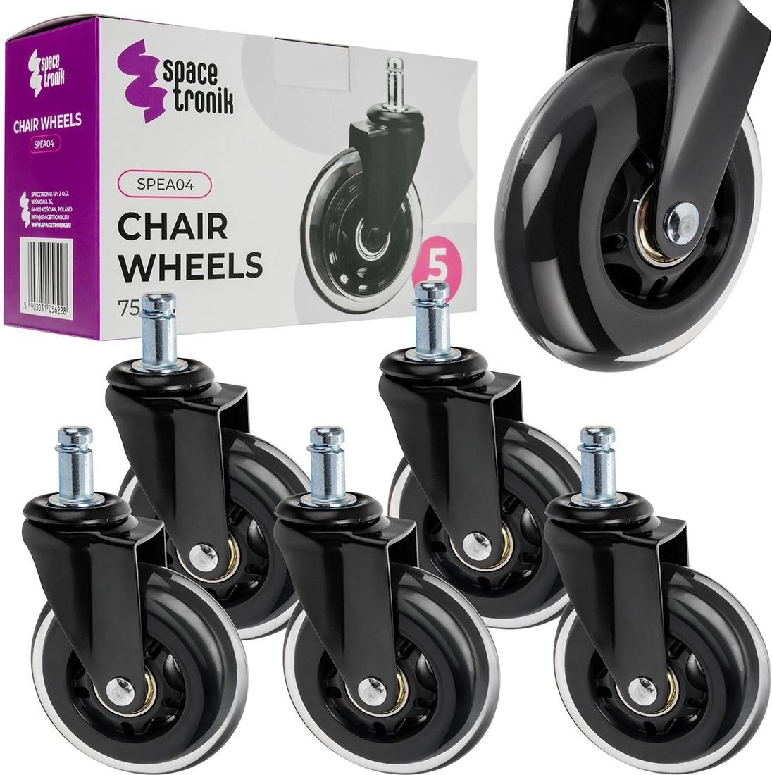 Wymienne kółka do foteli biurowych Spacetronik SPEA04. Ciche, na łożyskach – idealne do paneli, drewna i płytek. Średnica 75 mm, wysokość całkowita 11,5 cm.