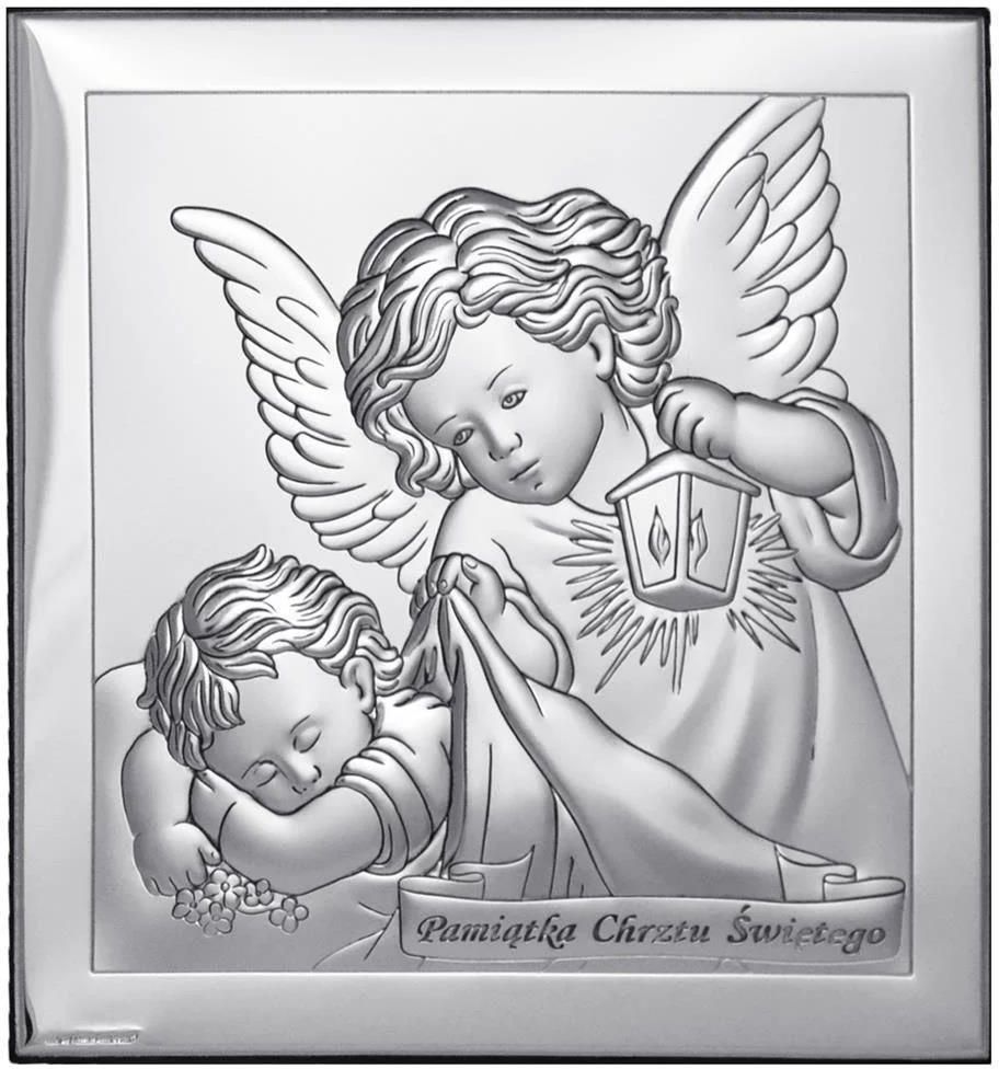 Obrazek srebrny Anioł Stróż z latarenką 12x12 cm Obrazek srebrny Aniołek z latarenką, z podpisem: "Pamiątka Chrztu Świętego". Idealny jako pamiątka z okazji Chrztu Świętego. Obrazek wyprodukowany został przez firmę Beltrami. Gwarantuje ona, iż przedmiot nabyty przez Państwa został wyprodukowany we Włoszech, zgodnie z kunsztem i tradycją obróbki metali szlachetnych. Do produkcji wykorzystano innowacyjny metal szlachetny o nazwie MIRO-SILVER, opatentowany na terytorium całej Europy. Jest to nowoczesny surowiec pokryty w procesie atomowym warstwą czystego srebra 999,95. Otrzymany drogocenny metal posiada wyjątkowe cechy, przewyższając jakością materiały pozyskiwane metodami tradycyjnymi. Jest odporniejszy na odkształcenia mechaniczne i śniedzenie, doskonale odbija światło, co podkreśla szlachetność srebra. Obrazek zabezpieczony jest warstwą lakieru, która chroni przed czynnikami zewnętrznymi. Wpływa to na bezproblemowe użytkowanie bez potrzeby częstego czyszczenia. Obrazek można zarówno powiesić, jak i postawić na dołączonej podstawce. Do czyszczenia zalecamy używanie wyłącznie czystych, miękkich ściereczek, a w przypadku zabrudzeń letniej wody. Nie należy stosować detergentów, alkoholu ani znajdujących się w sprzedaży środków i ściereczek do czyszczenia srebra, gdyż mogą one uszkodzić warstwę ochronną.