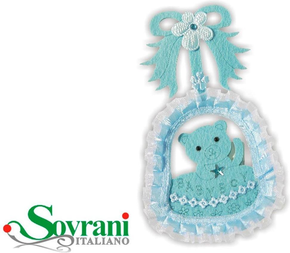 Ozdoba dziecięca niebieska Niebieska ozdoba. która swym kształtem przypomina dzwonek obwieszczający przyjście na świat małego chłopca. Wykonana została z przyjemnego w dotyku materiału. Można ją powiesić przy dziecięcym łóżeczku bądź też ozdobić nią wózeczek W środku niebieski miś z napisem BabyBoy i połyskującą gwiazdką. Dookoła niebiesko- białe. marszczone obszycie. Na górze niebieska kokarda i jaśniejszy kwiat. z błyszczącym kamyczkiem. Informacje o produkcie Rozmiar 16cm Rodzaj opakowania brak opakowania