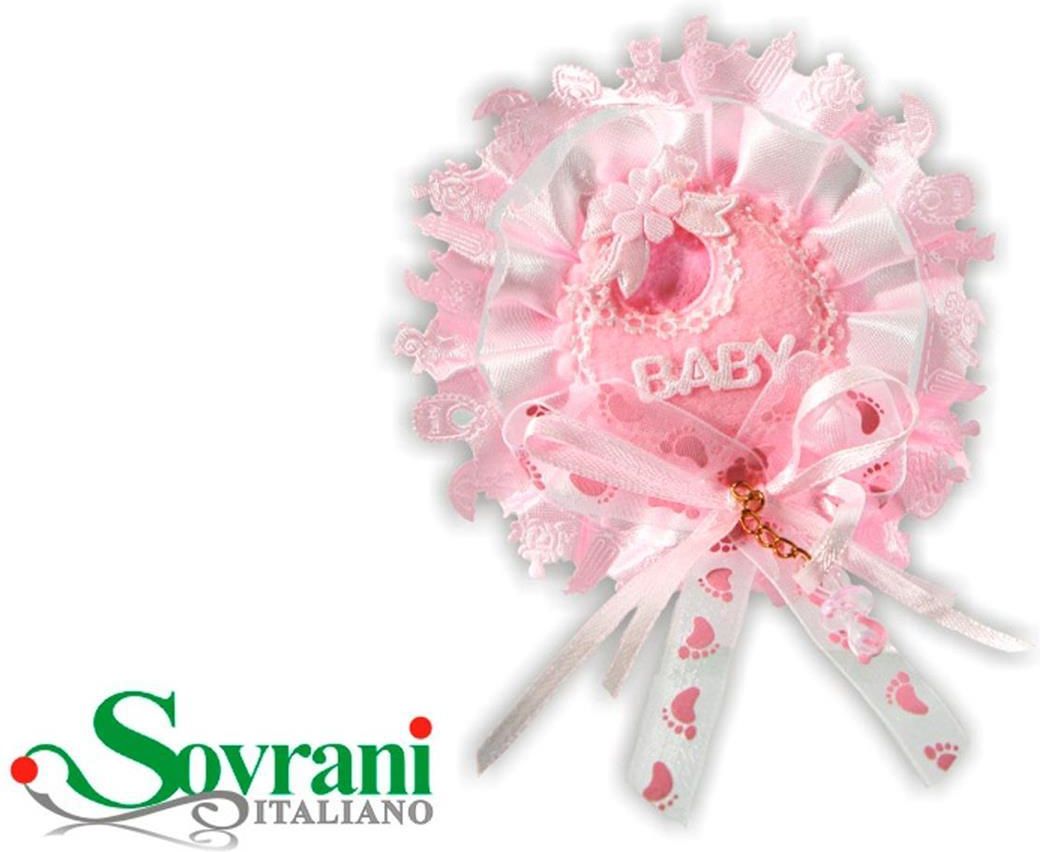 Ozdoba dziecięca różowa SOVRANI ITALIANO Śliczna różowa ozdoba dla nowonarodzonego dziecka. Wykonana z dużą starannością. stanowić będzie śliczny dodatek do dziecięcego łóżeczka bądź też wózka. Do jej wykonania wykorzystane zostały materiały o różnych odcieniach różu oraz biała kokarda. z maleńkimi różowymi stópkami i biała obszywka wewnętrznej części. Ozdobę obszyto różnymi elementami odnoszącymi się do maleńkiego dziecka. Informacje o produkcie Rozmiar 8cm Rodzaj opakowania brak opakowania