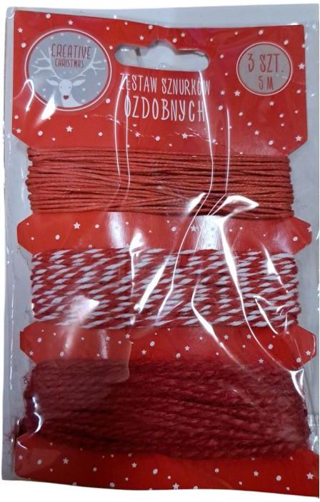 - zestaw sznurków ozdobnych - kolorystyka: czerwony, biały - wymiary jednego sznurka: 5 m - w opakowaniu 3 rodzaje