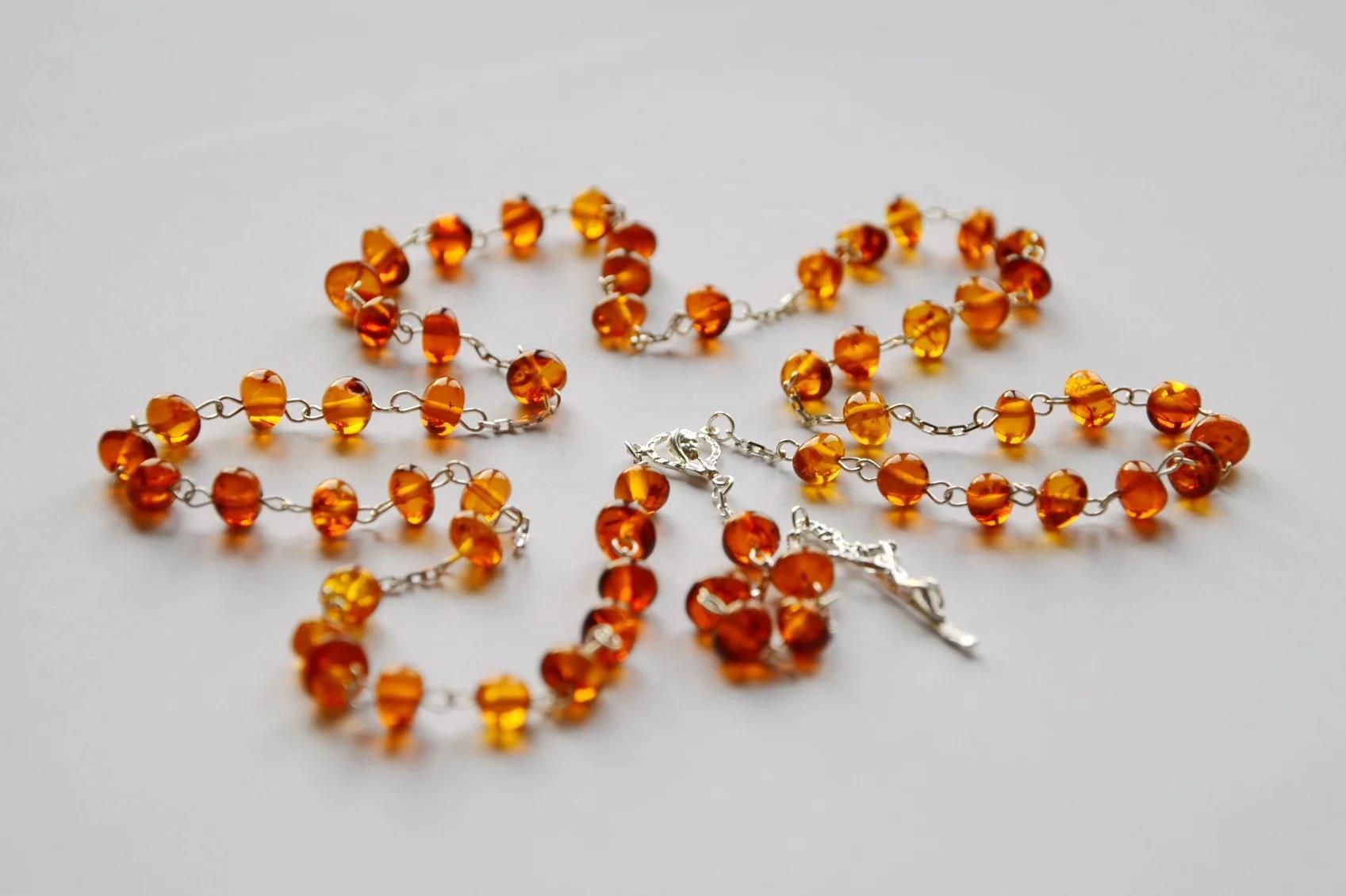 Różaniec z bursztynu naturalnego Koraliki z oszlifowanego bursztynu, pozostałe elementy wykonane ze srebra. Waga różańca 9-10 g (w zależności od egzemplarza). Wielkość koralika - około 5 mm.